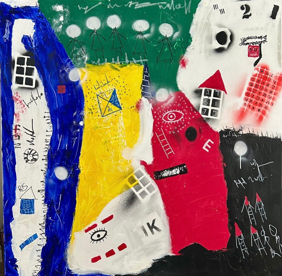 Houses ,numbers and eyes come together to form a colourful soul map,a city that lives beneath the surface.