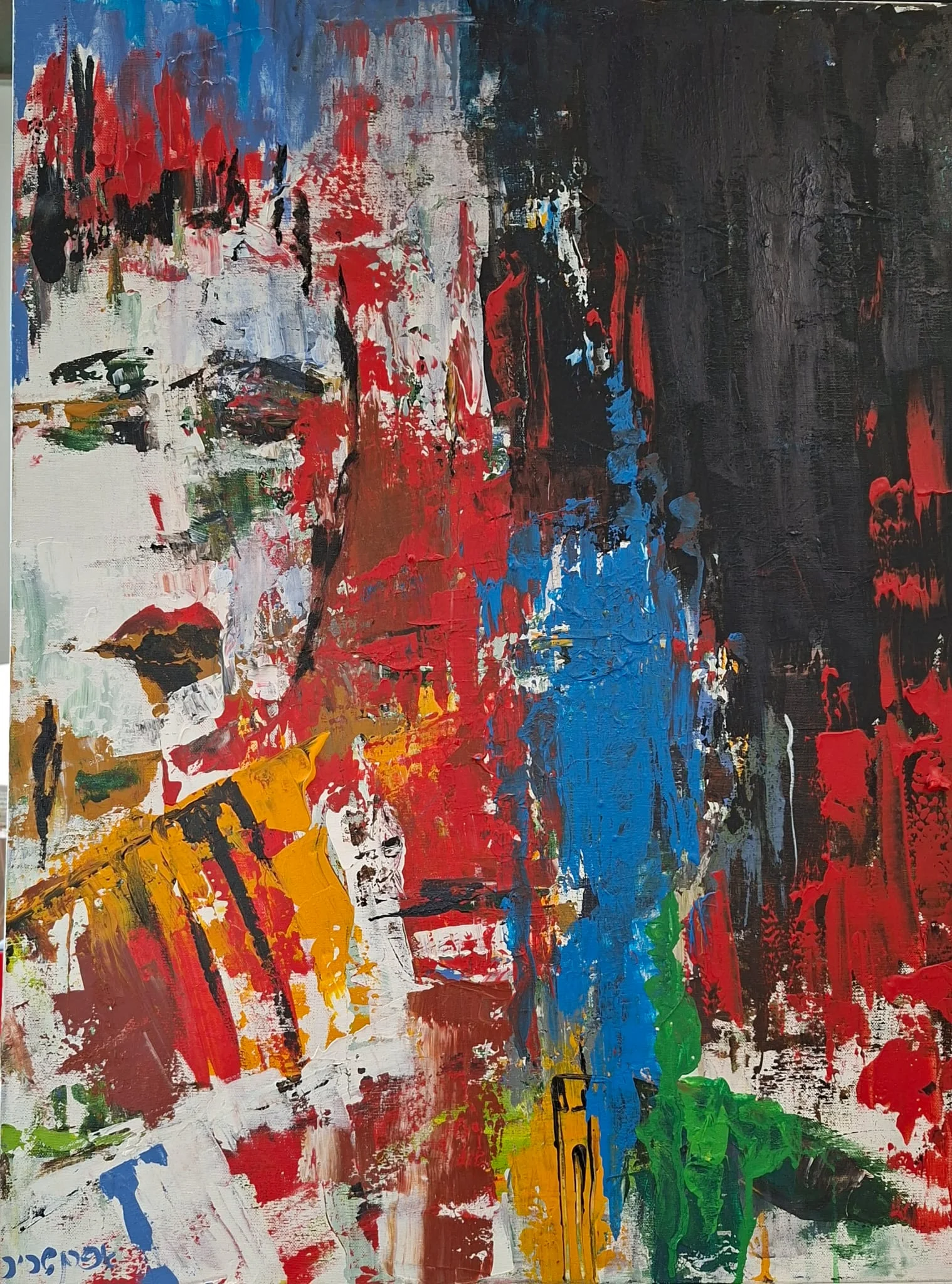 An expressive abstract composition built through layered gestures, bold contrasts, and rich textures. The work explores inner emotional states through a dynamic interplay of black, red, blue, and white, creating tension, movement, and depth across the surface.