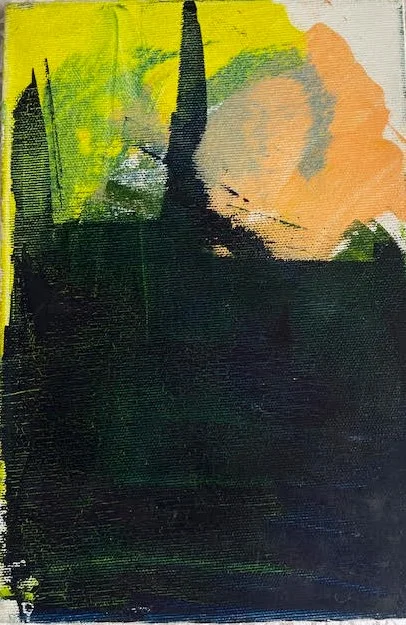 In "Jackie Kennedy" (20X30 cm), Abisdris performs a radical act of abstraction. Instead of the First Lady's familiar portrait, she presents a composition of bold color fieldsโdeep black, neon yellow, and hints of peach-pink. The piece examines visual memory and the way a public figure is transformed into abstract visual energy. Through expressive brushstrokes on textured canvas, she raises questions about visibility, disappearance, and the emotional resonance that remains of an image once it is stripped down to its most basic elements.