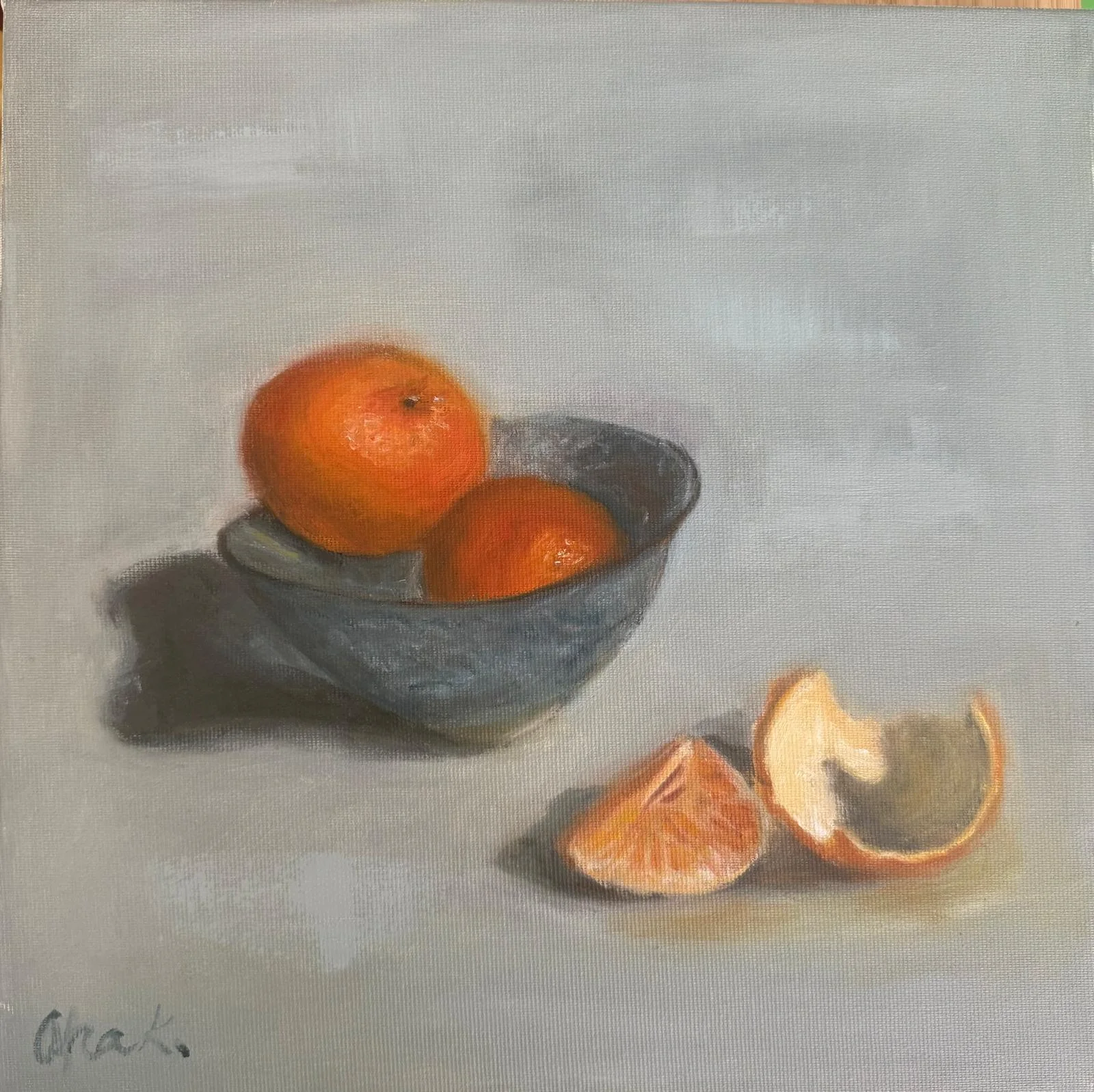 A delicate still life painting of clementines arranged in a ceramic bowl, with peeled segments placed in the foreground. Soft tonal transitions, restrained color harmony, and quiet observation evoke the atmosphere of late winter.