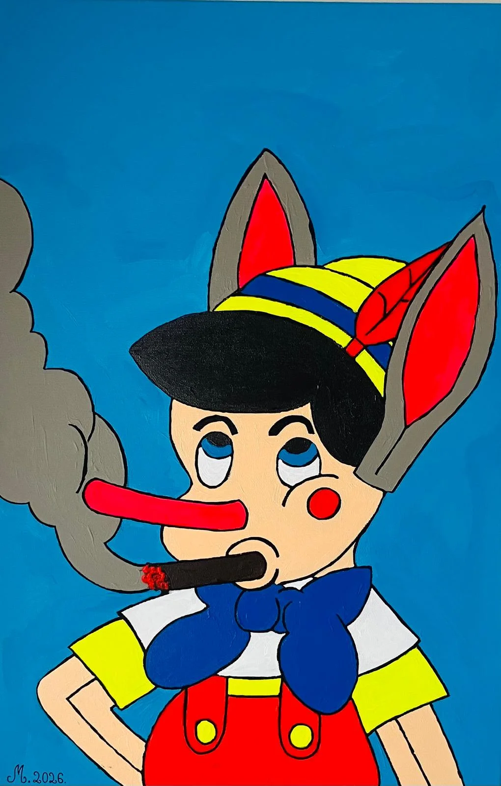 A bold contemporary figurative painting that reimagines Pinocchio through pop-inspired color and simplified cartoon-like form. Exaggerated features, a cigar, and the iconic elongated nose introduce irony and tension, turning a familiar childhood character into a reflection on distortion, performance, and self-deception.