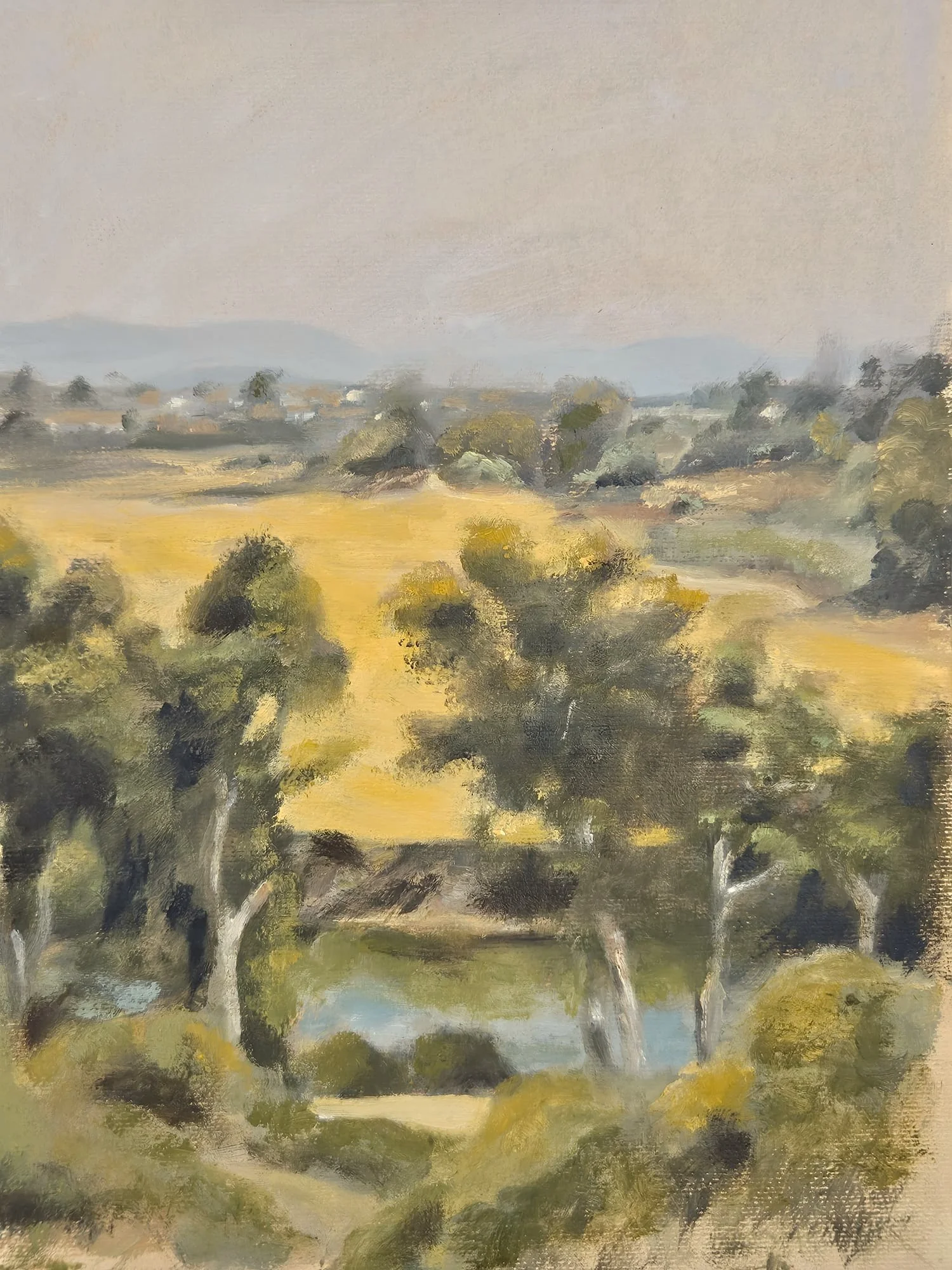 A lyrical landscape painting inspired by the scenery of Nahal Alexander, rendered in soft, atmospheric brushwork and a muted natural palette. The composition captures the quiet meeting of trees, water, and open fields, conveying a sense of light, distance, and calm Mediterranean landscape.