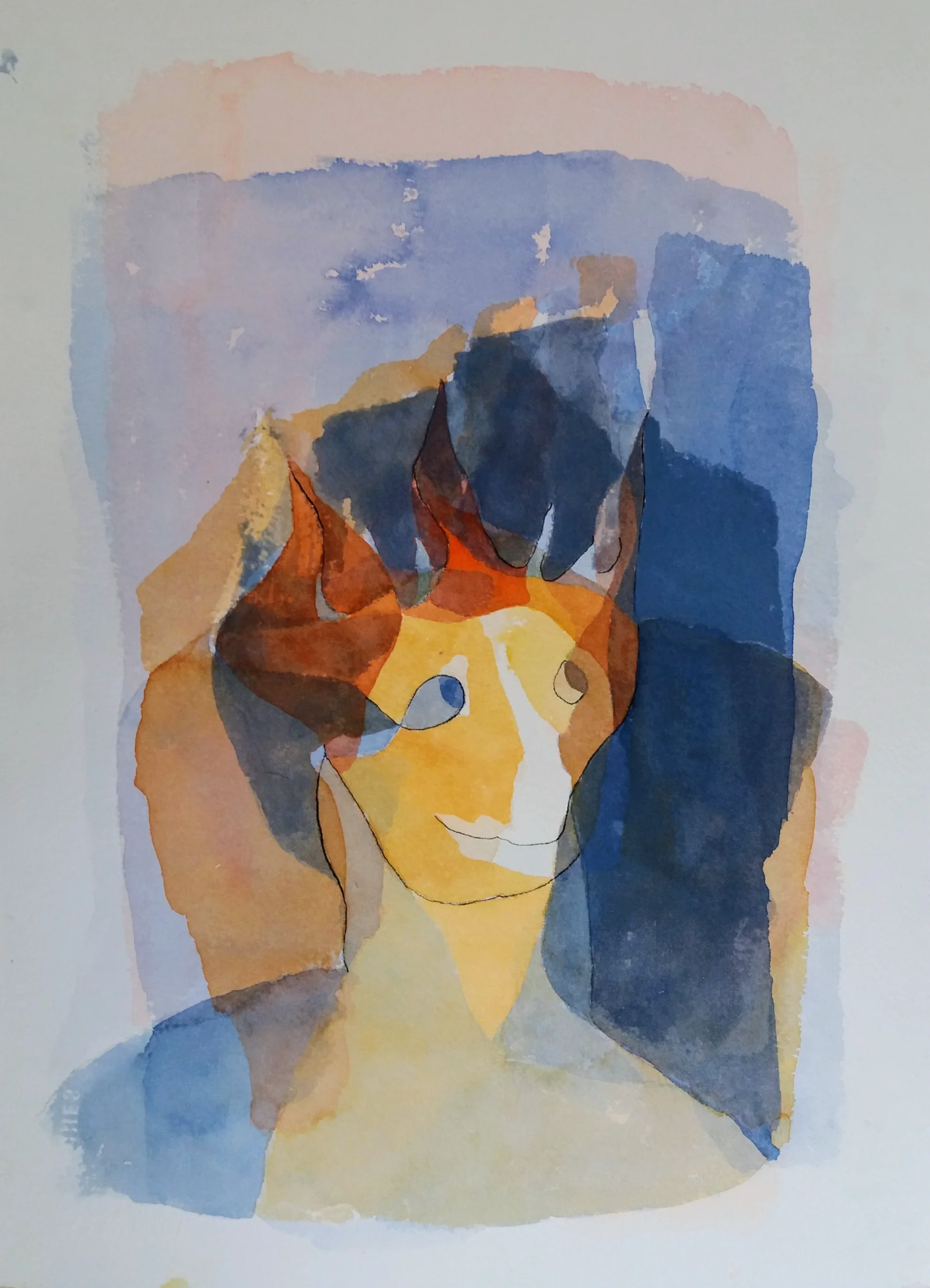 A small, playful, and friendly fire being that inspires creativity. Drawn in intense layers of watercolor, with a minimalist combination of pen to create a close, non-abstract figure.