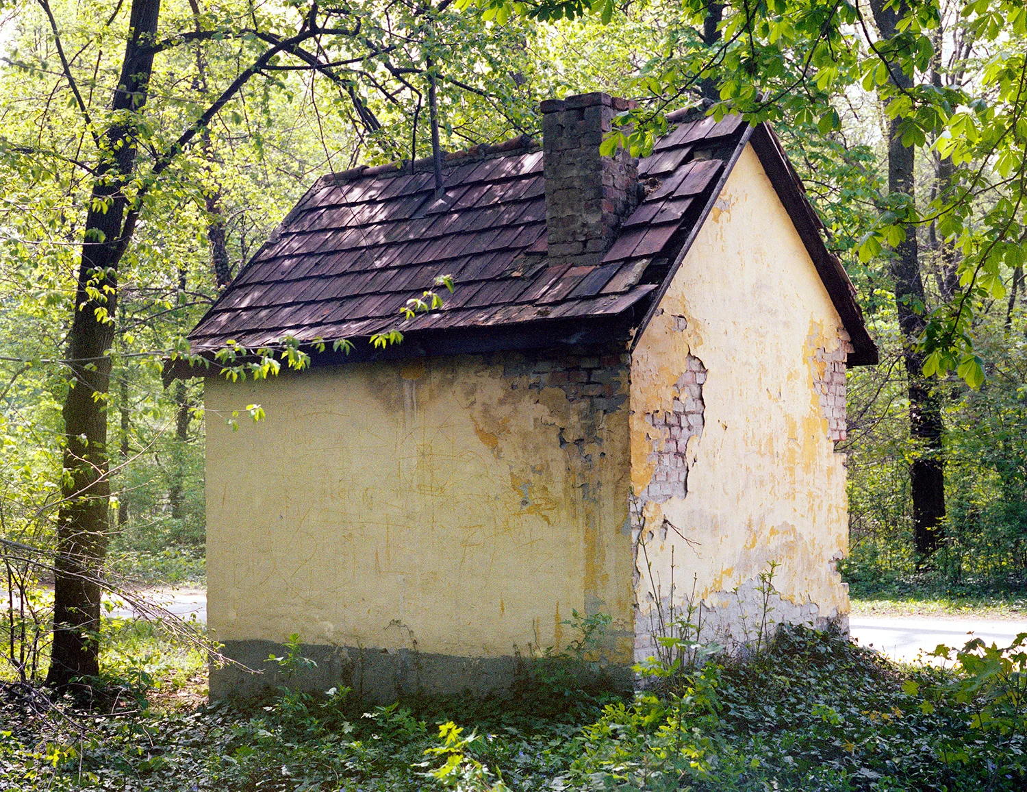 A small, old stone house stands in the heart of a green forest, its roof tiles and peeling walls bearing the marks of time. A springlike, nostalgic atmosphere with a gentle romantic touch. Traditional photography on medium format negative.
