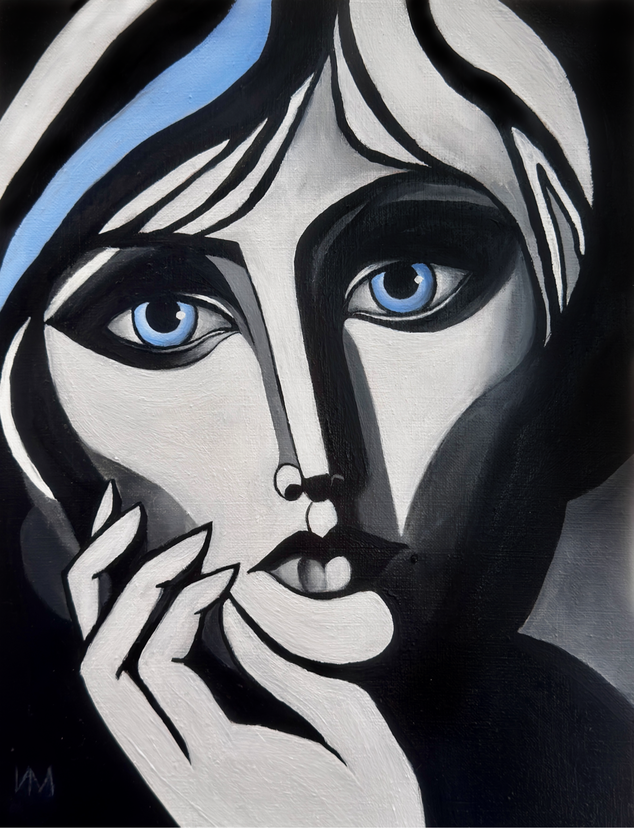 הציור "Loneliness" מבטא מצב של שקט פנימי, כאשר האדם נשאר לבדו עם מחשבותיו. פלטת צבעים מונוכרומטית וקונטרסטית והגיאומטריה המדויקת של הצורות יוצרות תחושת ריחוק, בעוד שהעיניים הכחולות הקרות הן הנקודה החיה היחידה החושפת את עומק החוויה הרגשית.