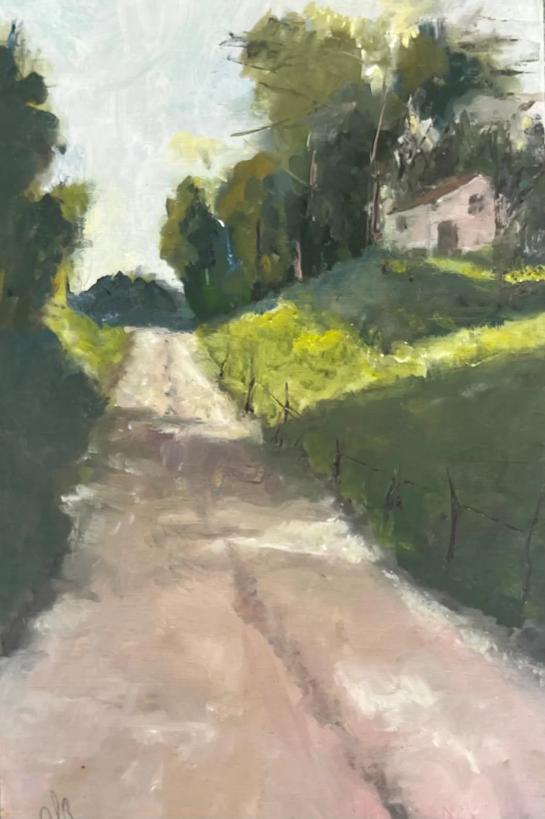 An impressionist landscape depicting a quiet country path bathed in soft light, with expressive brushwork and a restrained, atmospheric palette that evokes memory and longing.