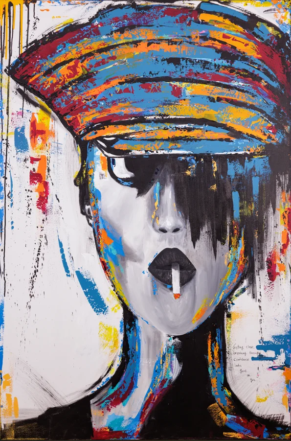 A bold, rule-breaking figure balancing control with a burst of color. The vivid cap and obscured eye create a sense of mystery—an untold story that’s deeply felt. *Available for order in various sizes, with pricing adjusted accordingly