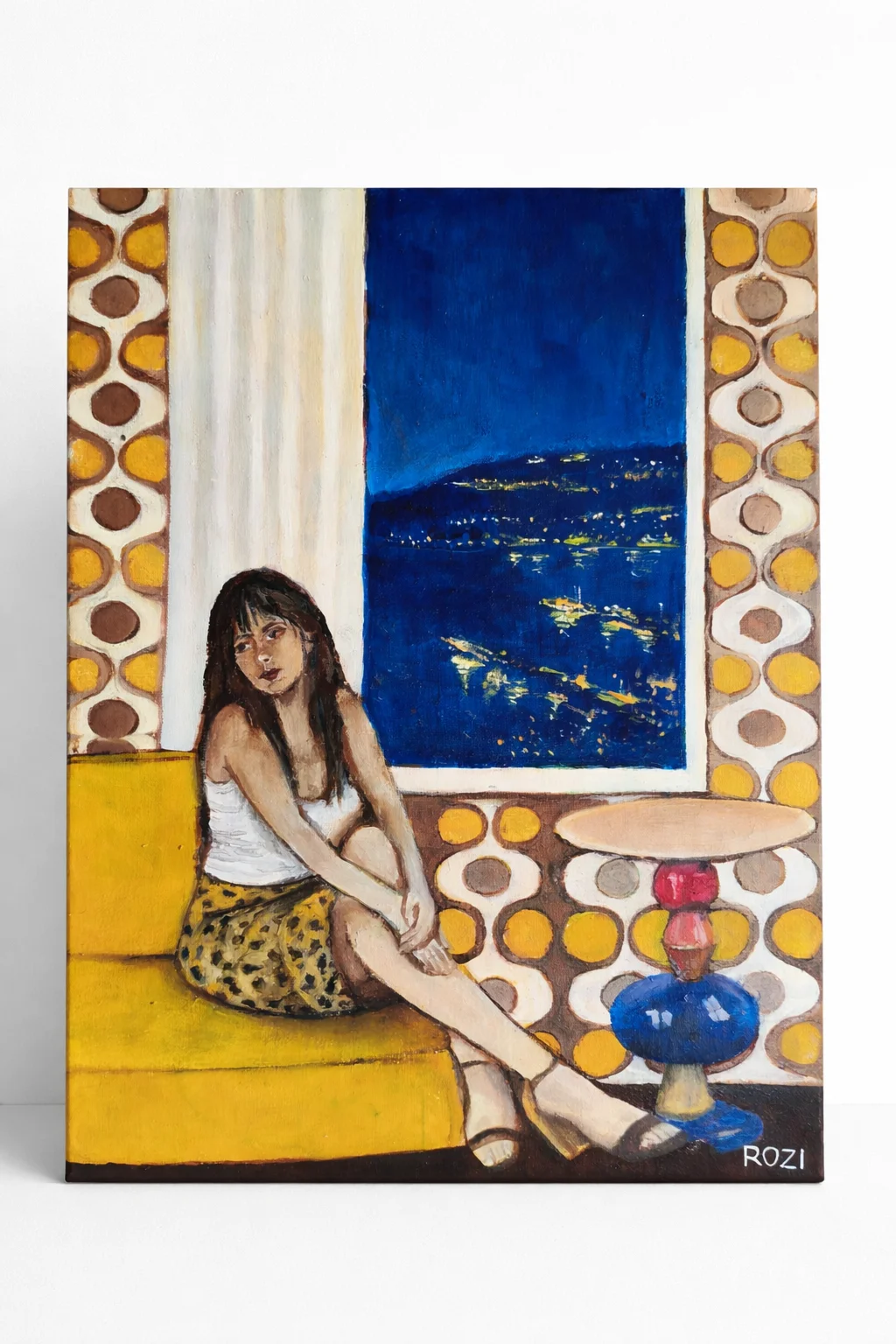 A woman sits by a window overlooking the glowing night view of Haifa Port, where the interior design and decorative wall create a warm contrast against the cool shimmer of the bayโs lights. The composition balances an intimate atmosphere with an urban one, blending design nostalgia with the quiet poetry of a city seen from afar.
