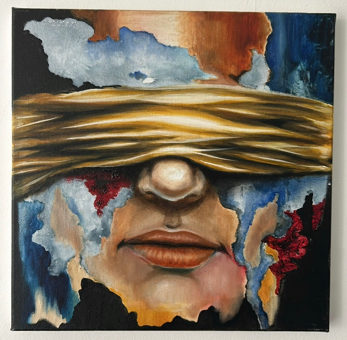 One of a series of three, this triptych combines mixed media—watercolor and oil on canvas—to offer a poignant modern interpretation of the ancient Japanese symbol of the "Three Wise Monkeys," which represents the moral principle of avoiding evil. In this specific piece, a golden band covers the subject's eyes. In contrast to the historical source where hands cover the eyes, the choice of a gilded material raises questions about willful blindness or concealment driven by considerations of prestige and status. The nose and lips remain exposed, emphasizing the persistence of a sensory world even within visual darkness. The connection between the three portraits creates a philosophical statement on the modern human condition. While the ancient source advocated for moral purity, this work suggests that in contemporary society, these principles have morphed into tools of detachment and ignorance. The interplay between the transparency of watercolor and the opacity of oil underscores the conflict between the exposed soul and the masks we choose to wear.