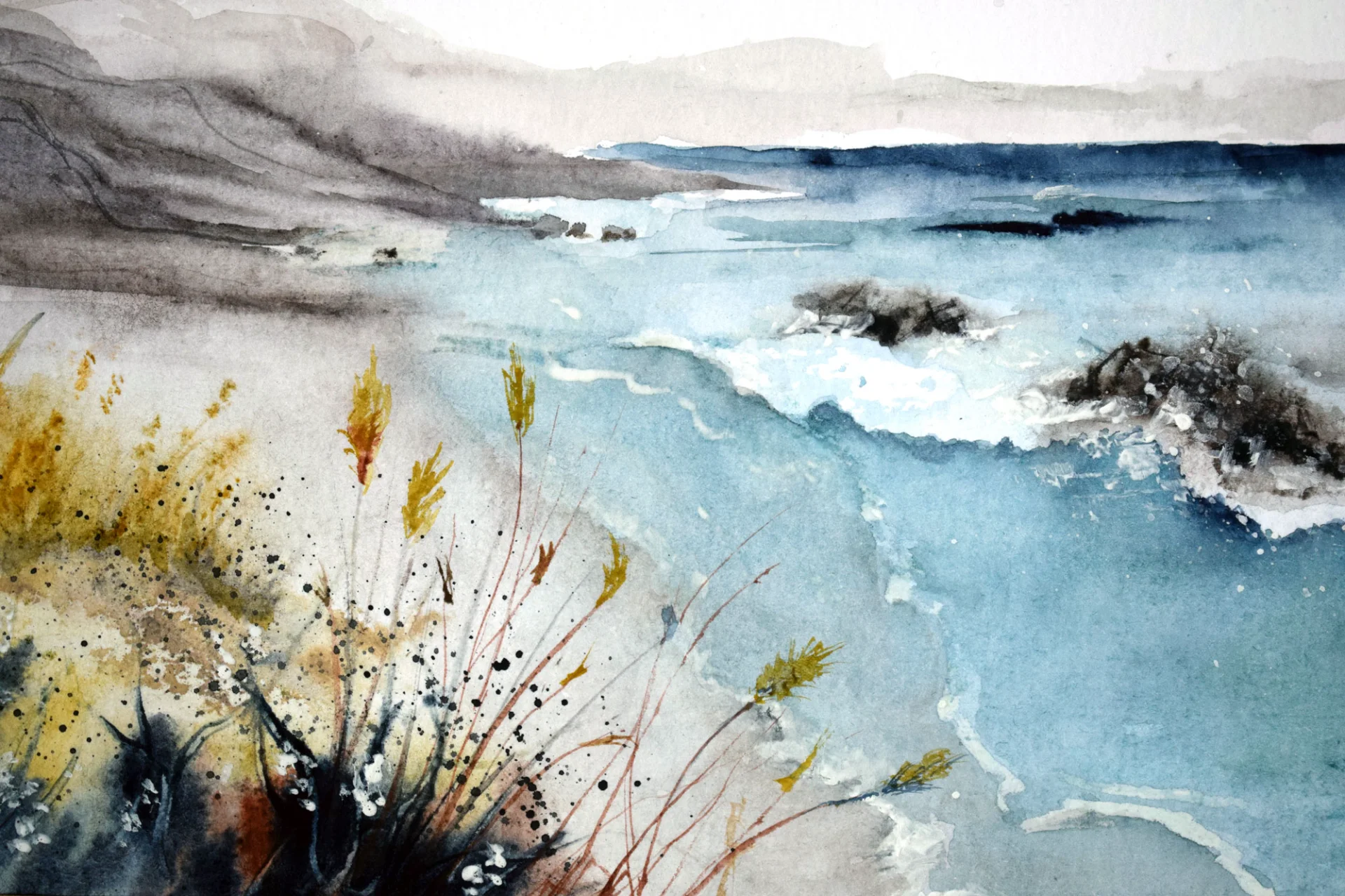 Watercolor painting capturing a coastal ocean scene with turquoise waves, foamy surf, and golden grasses in the foreground, set against misty grey hills