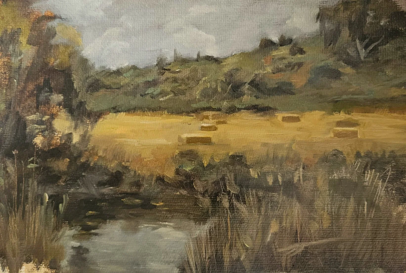An atmospheric landscape painting inspired by Nahal Alexander, capturing the quiet dialogue between water, reeds, and open terrain through muted earthy tones and expressive brushwork.