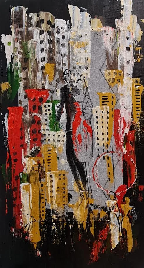 A powerful original mixed media painting depicting a dynamic and lively urban landscape. A composition of tall, colorful buildings creates a sense of a vibrant city, with the free brushstrokes and combinations of materials giving the painting depth, movement and energy. Black, white and gray tones create a dramatic background against which buildings in red, yellow and gold stand out, adding warmth and impressive contrast. At the center of the work is a mysterious figure on a bicycle, moving between the buildings and adding a personal story within the busy urban space. The abstract elements alongside the architectural forms create a balance between reality and imagination, and invite the viewer to interpret the city in their own way. This is a modern painting full of character and atmosphere, especially suitable for spaces designed in a contemporary style and gives a sense of depth, movement and original art with an impressive presence.