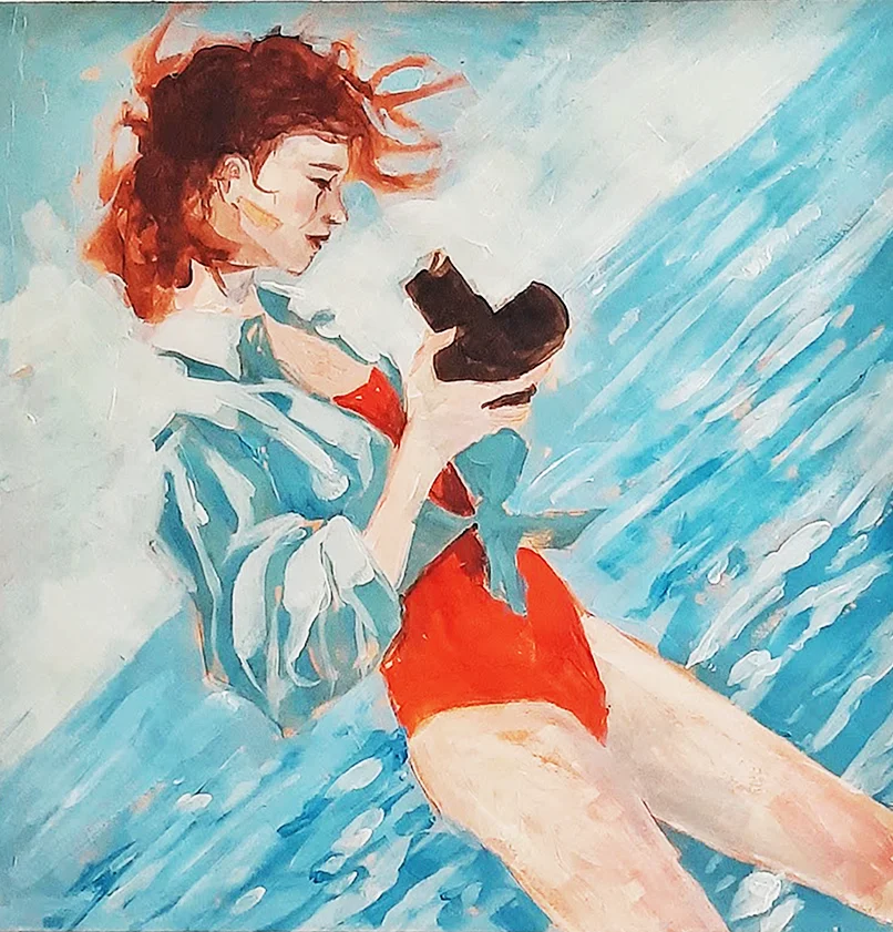 A painting in delicate shades of light blue with touches of vivid red, depicting a young woman holding her camera, absorbed in a quiet, intimate moment. She appears slightly detached from her surroundings, focused on the camera itself, as if the act of observing begins within her. The blue and white tones of the sea merge with her shirt, gently returning her to the surrounding landscape without disturbing her stillness. The painting reflects a subtle, quiet enjoyment- an inward connection through a simple action, where observation turns inward as much as it engages with the outside world.