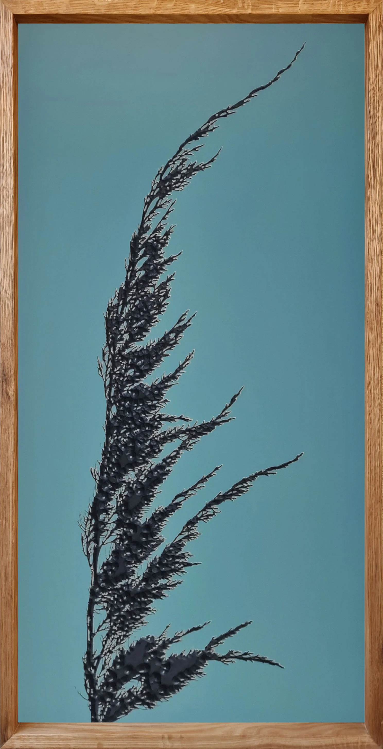 A refined engraving derived from a photographic study of a cypress branch, emphasizing the delicate rhythm of the foliage against a luminous blue ground. The work combines botanical observation with a contemporary, minimalist sensibility and a strong vertical presence.