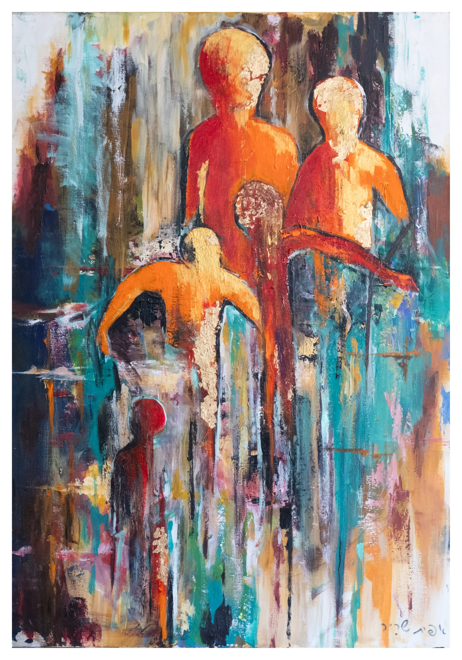 An expressive abstract-figurative painting featuring luminous orange human forms layered over a richly textured background of turquoise, brown, and cream. The work explores presence, movement, and emotional connection through energetic brushwork and dripping paint.