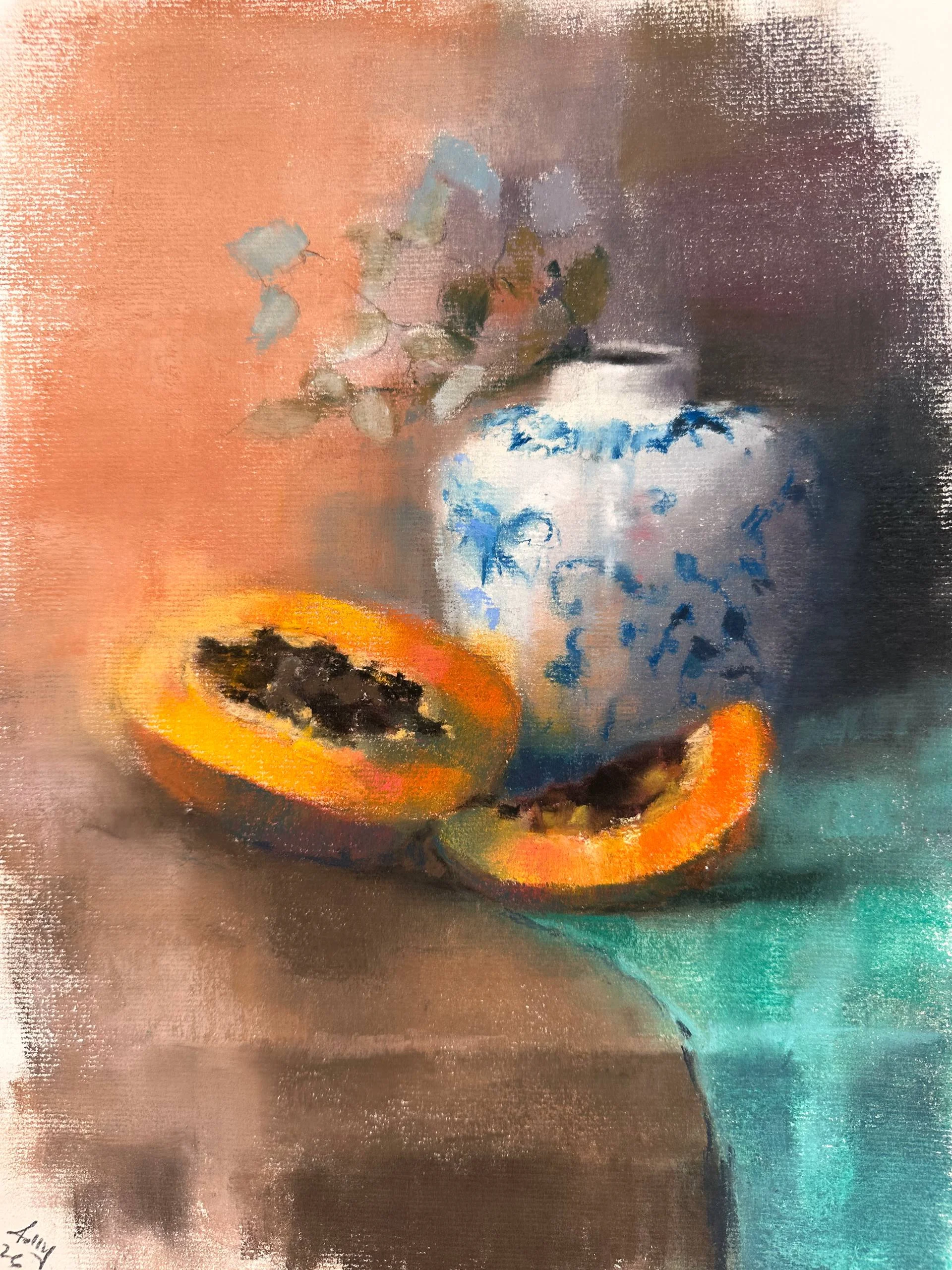A soft pastel work that brings together vibrant tropical tones and traditional aesthetics. The piece features a split papaya at its peak ripeness alongside a decorated porcelain vase, emphasizing the complementary contrast between brilliant oranges and deep blues. The dusty texture of the pastel and the soft treatment of the background lend the painting depth,