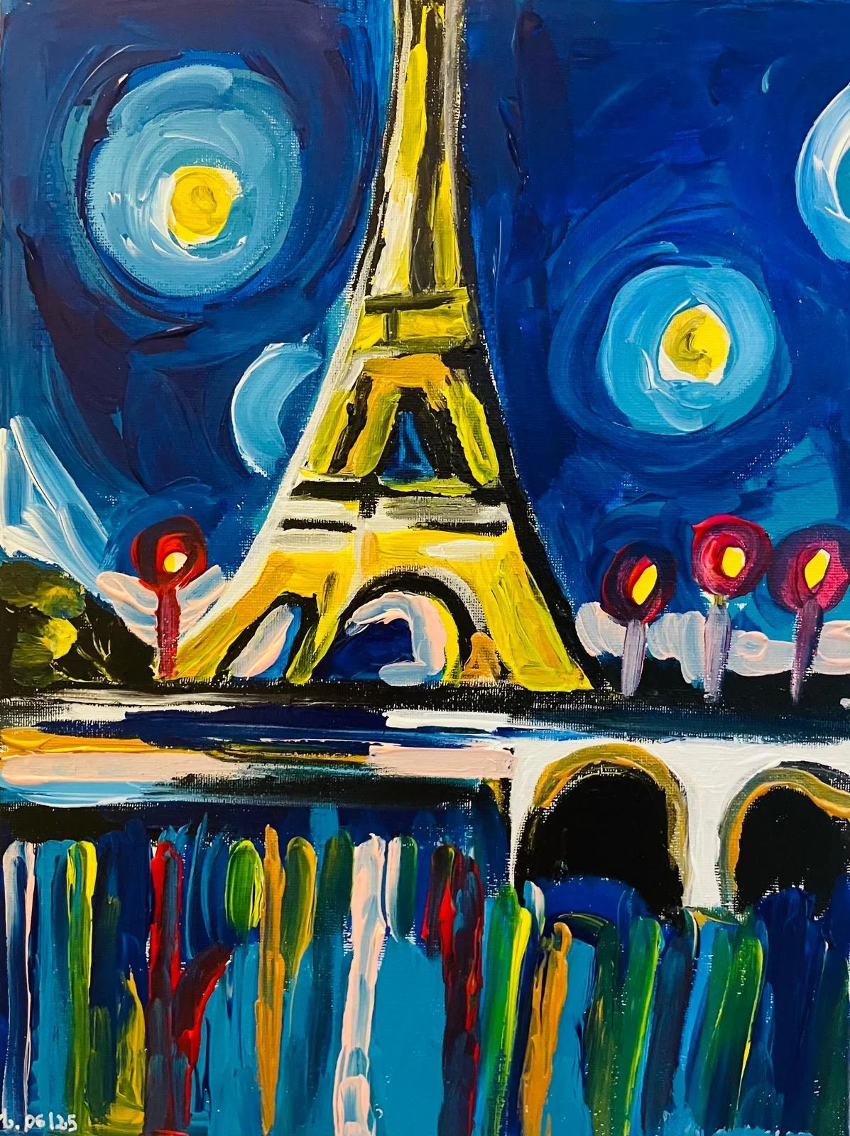 This acrylic painting captures Paris at night through bold, instinctive brushwork and saturated color. The Eiffel Tower stands at the center, but it’s the movement around it—the swirling sky, glowing lights, and dripping reflections—that drives the piece. Rather than a quiet cityscape, Paris becomes fluid and alive, almost in motion. The reflections stretch and blur, turning the scene into something emotional rather than literal—a memory of the city more than the city itself. Balancing structure and spontaneity, the work reimagines a familiar landmark through energy, color, and feeling rather than precision.