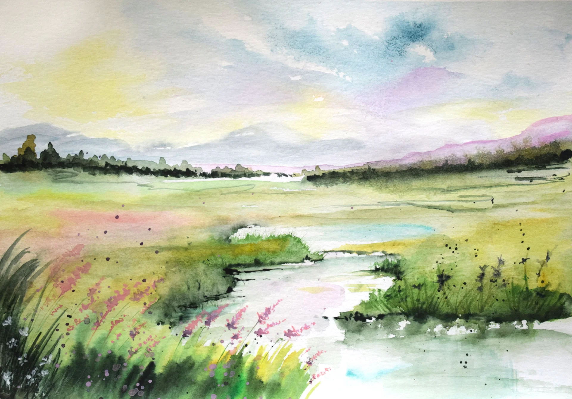 A watercolor painting of a spring landscape in soft pastel greens and pinks