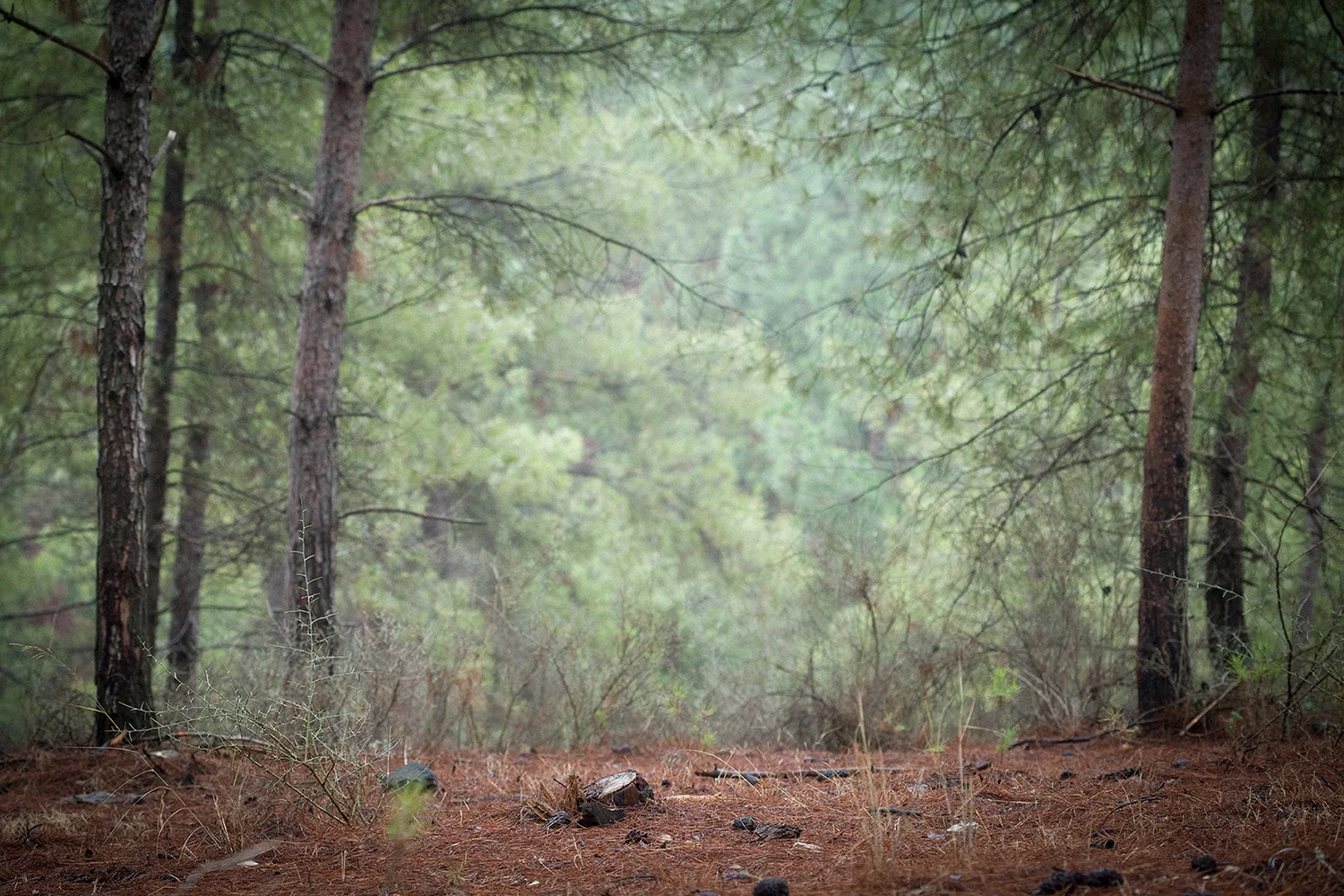 A quiet spot in the heart of a green forest, where brown earth meets trees stretching toward the horizon. The gaze is invited to enter a space that is both real and dreamlike—calm and beautiful.
