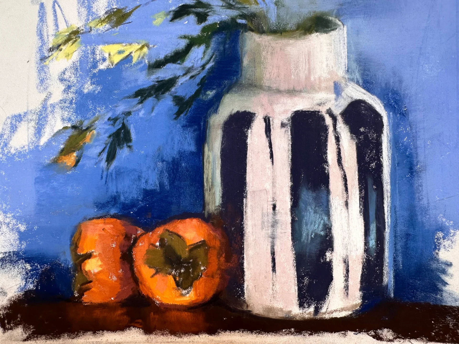 A pastel painting based on the bold contrast between orange and blue. The piece features two ripe persimmons alongside a large white vase, rendered in a free and expressive style. The raw color strokes and loose handling give this still life a fresh, modern feel.