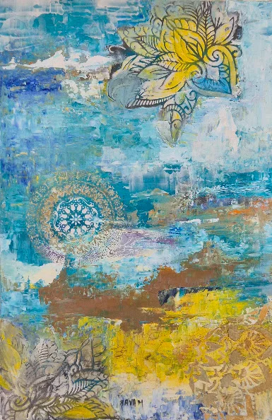 הציור מתאר נוף שליו עם אלמנטים מופשטים. ציור מרגיע ובנוסף יש אלמנטים שמיים, אדמה, אויר ואש כל אחד יכול למצוא את עצמו ואת איכותו בציור הזה. אפשר להתבונן שעות רבות. דרכו אני עושה מדיטציה.