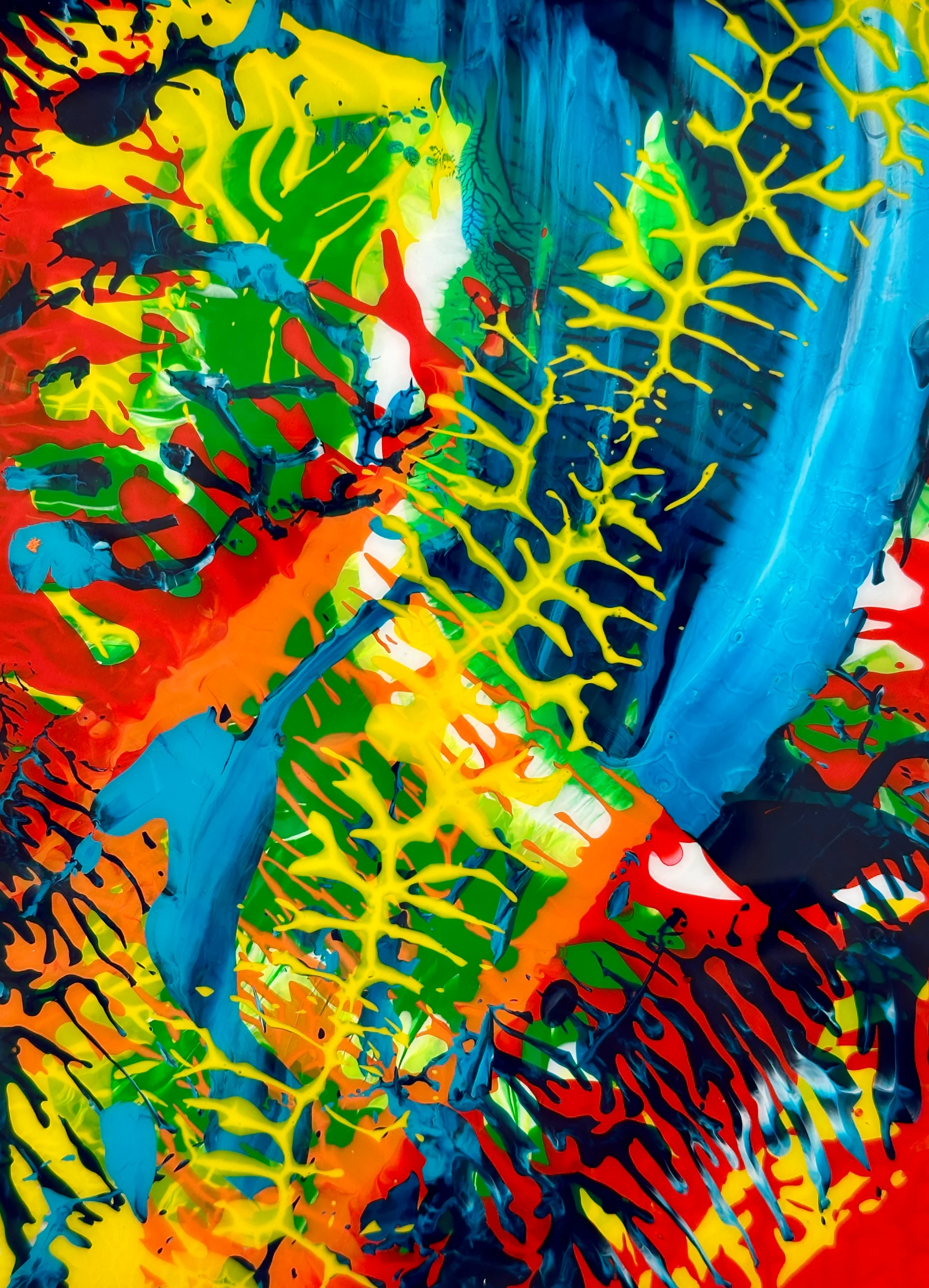 “התרגשות” מסדרת דנדרון נבנית בשכבות צבע אינטואיטיביות, זרמים של כחול, ירוק ואדום נפגשים עם רשת הסתעפויות צהובה, כמו מערכת צמיחה שמתעוררת. העבודה מותירה מרחב פתוח לפרשנות אישית, בין דופק מהיר לבין התרחבות חיה של אור וצבע.