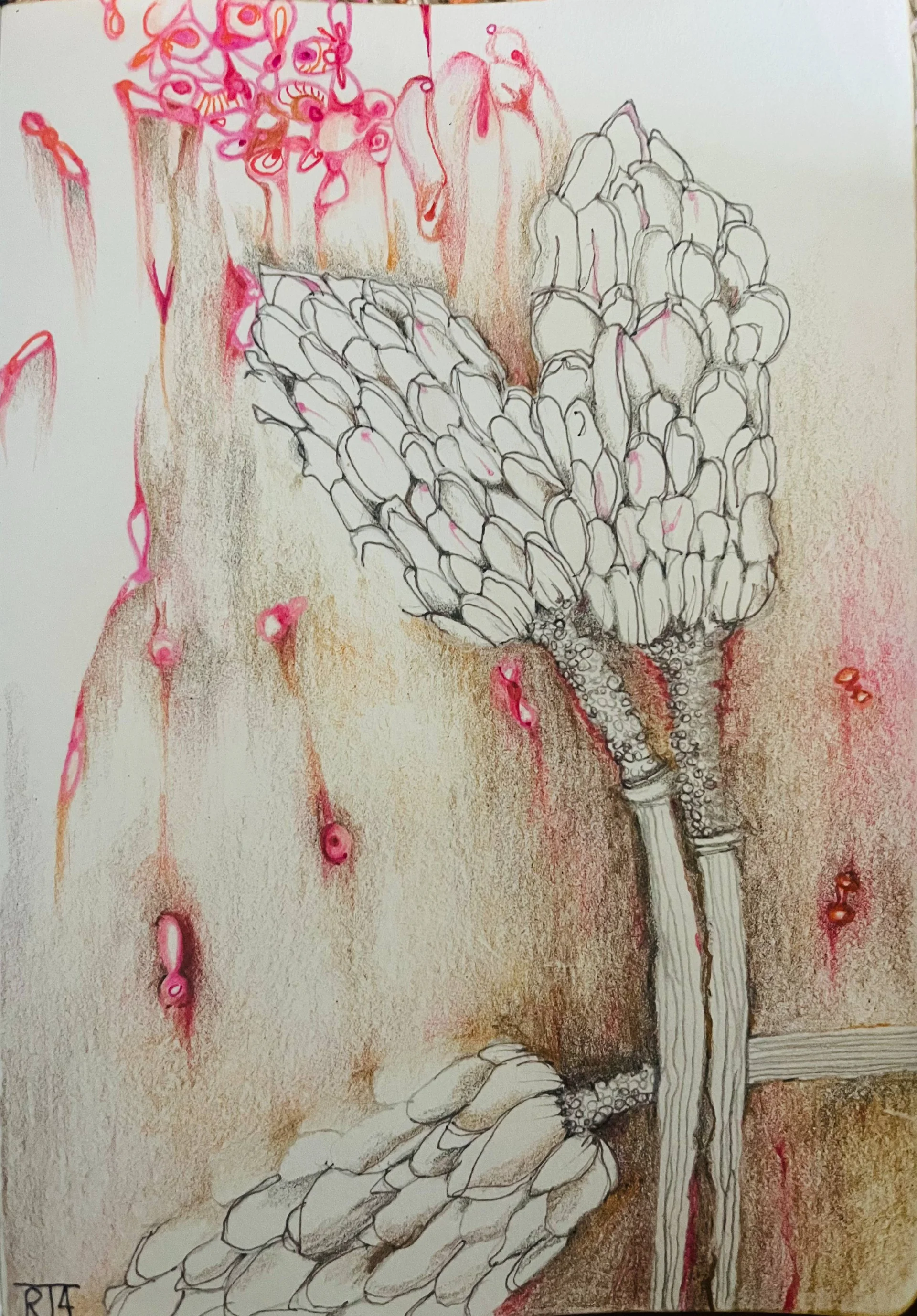 A "wounded" drawing that gives the feeling of a juicy, bleeding pomegranate. Abstract nature, oil and graphite pencils.