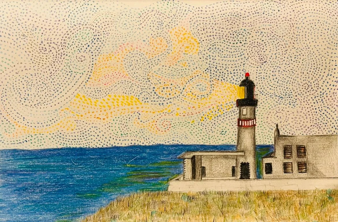 Drawing with graphite and oil pencils in POINTILLISM method to emphasize the spread of light.