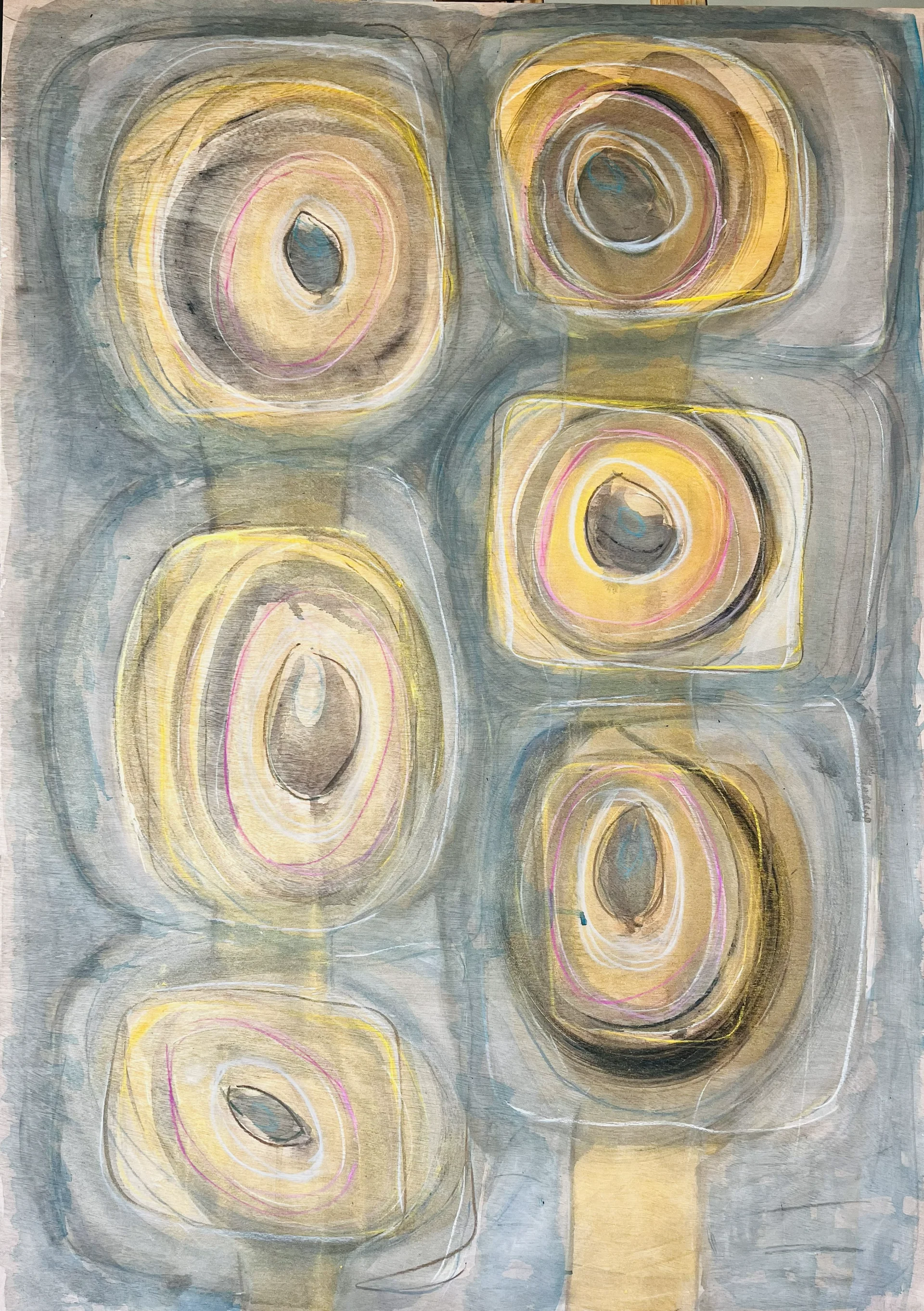 Circular forms carrying a dark core at their center, surrounded by halos of light in shades of gold, pink, and blue-gray, creating a sense of depth. A vertical, rhythmic arrangement evokes a feeling of certainty, calm, and meditative contemplation.
