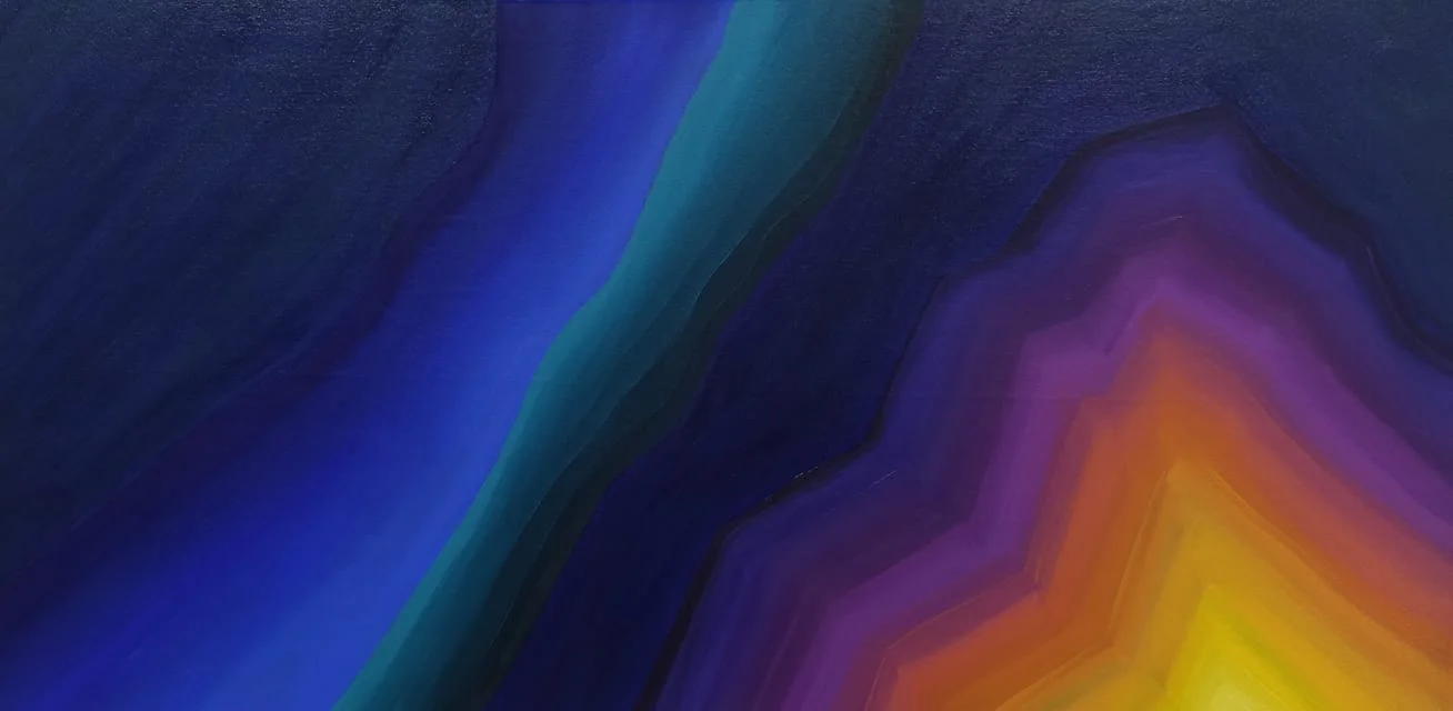 An abstract composition exploring the tension between inner emotional states—smoldering warmth and cool restraint. Through layered transitions of deep blue, violet, and glowing amber, the work evokes a quiet psychological landscape of contrast, balance, and contained intensity.