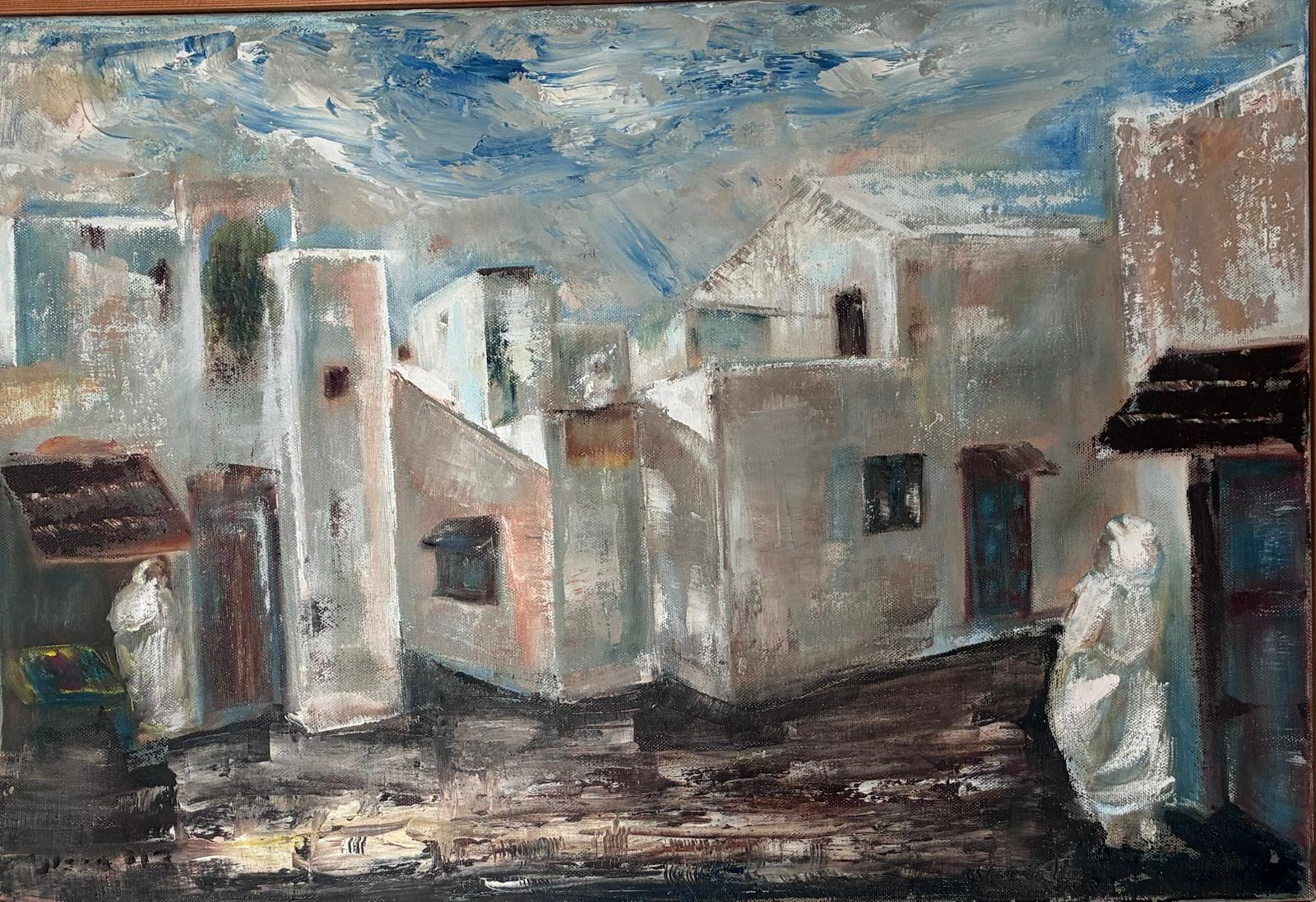 An atmospheric painting inspired by a Moroccan street scene, rendered in a muted palette with expressive brushwork and soft architectural forms. The work captures the quiet rhythm of daily life through layered texture, light, and painterly abstraction.