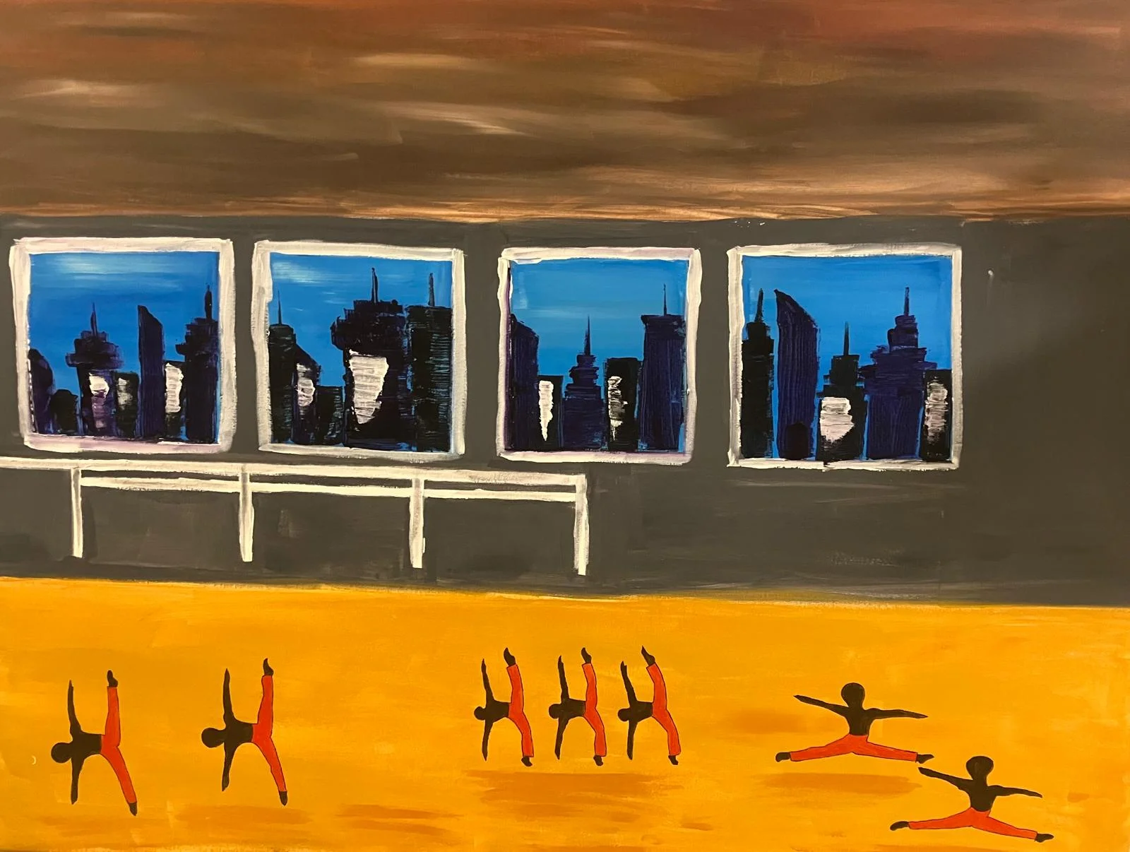 A contemporary figurative painting inspired by the artist's memories as a dancer in New York. Set within a quiet rehearsal studio, silhouetted dancers move in rhythm before a bold urban skyline, balancing stillness and motion through simplified forms, strong contrasts, and expressive color.