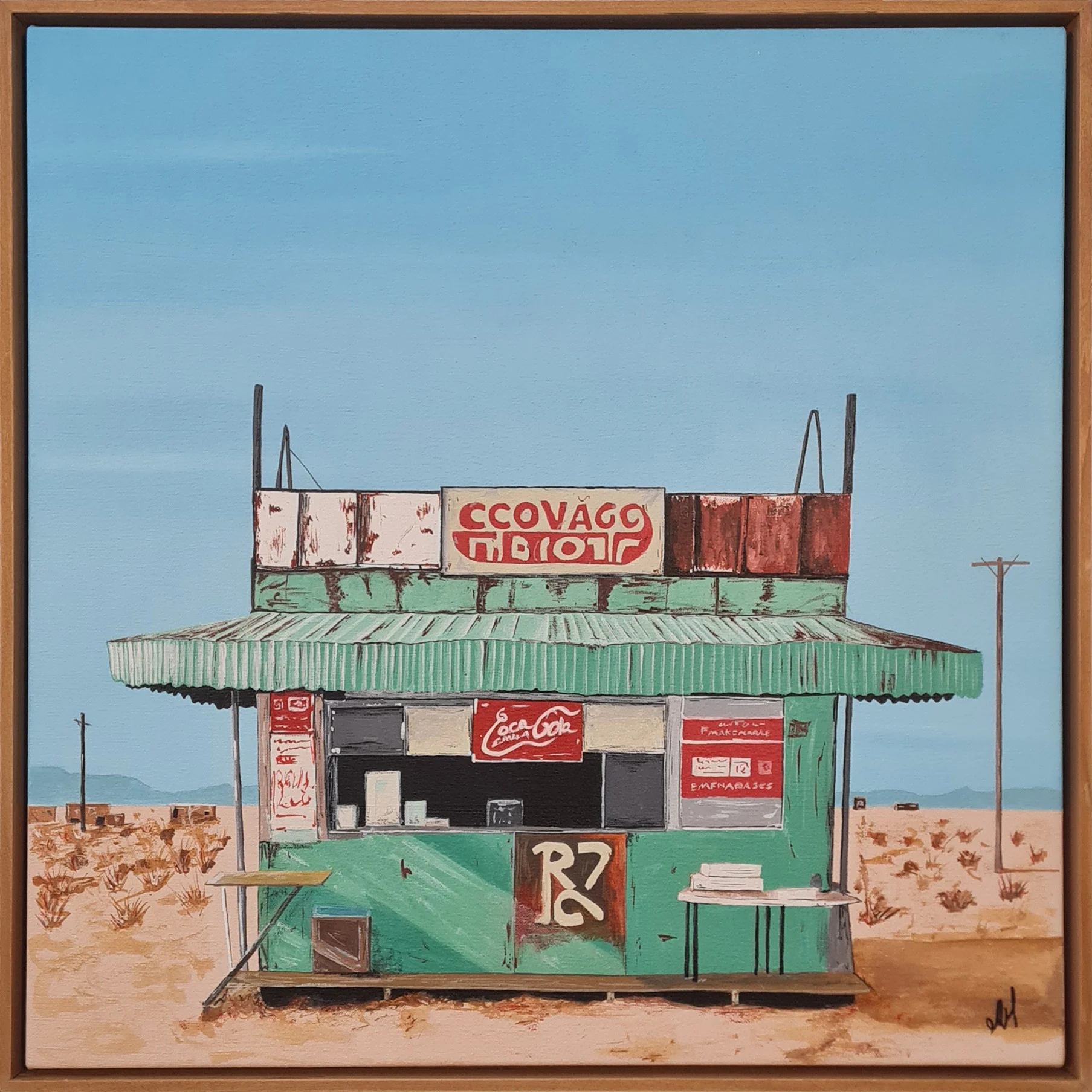 An original painting depicting a solitary roadside kiosk set in an open desert landscape. The work combines a restrained palette with graphic details and a sense of quiet narrative, capturing the tension between isolation, memory, and everyday roadside culture.