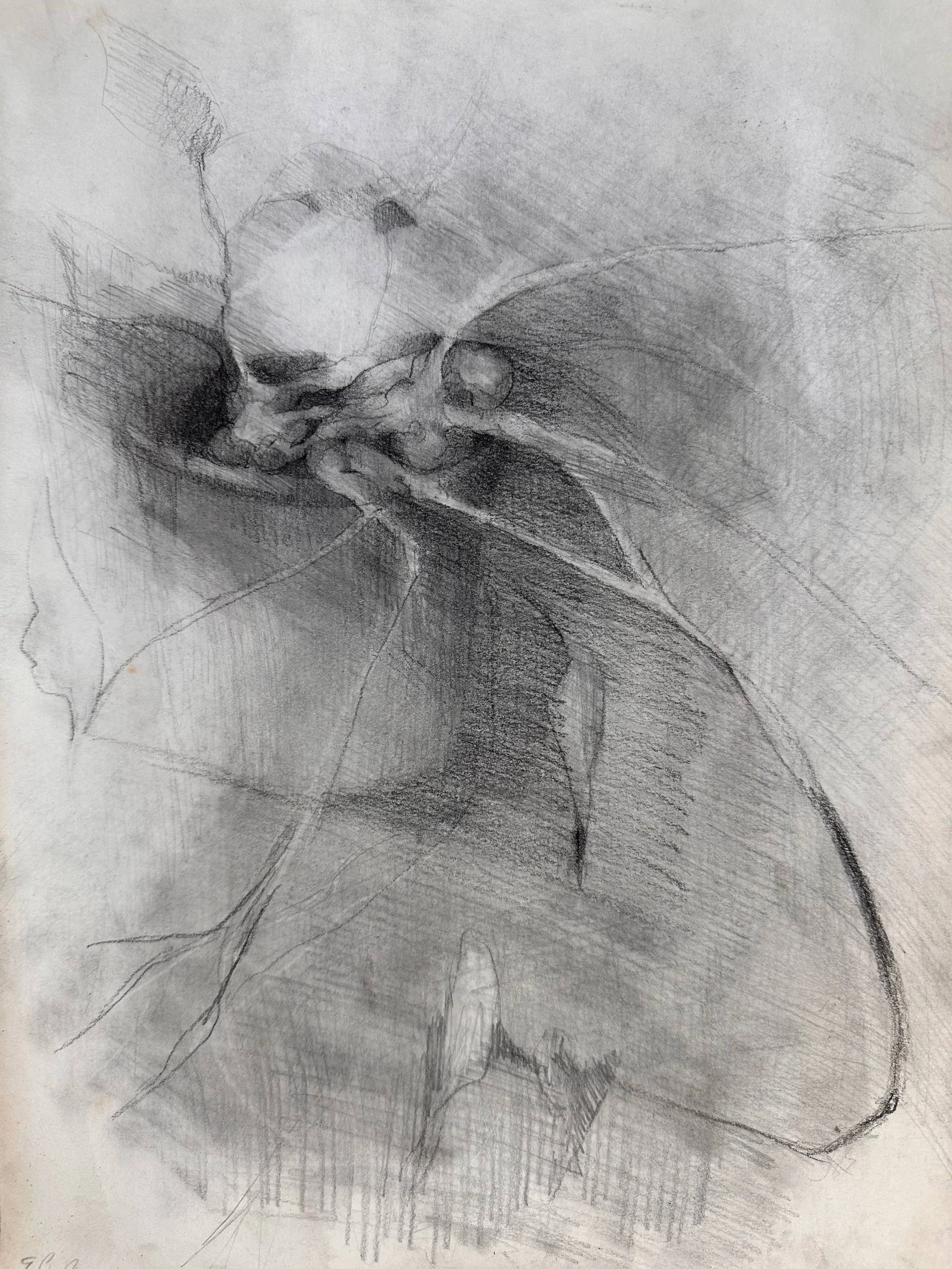 A visceral charcoal drawing that delves beneath the surface. It captures a core of raw energy with dynamic, almost frenetic hatching and smudging. The loose lines and implied skeletal structure create a sense of primal force, showing the raw vitality that exists in everything.