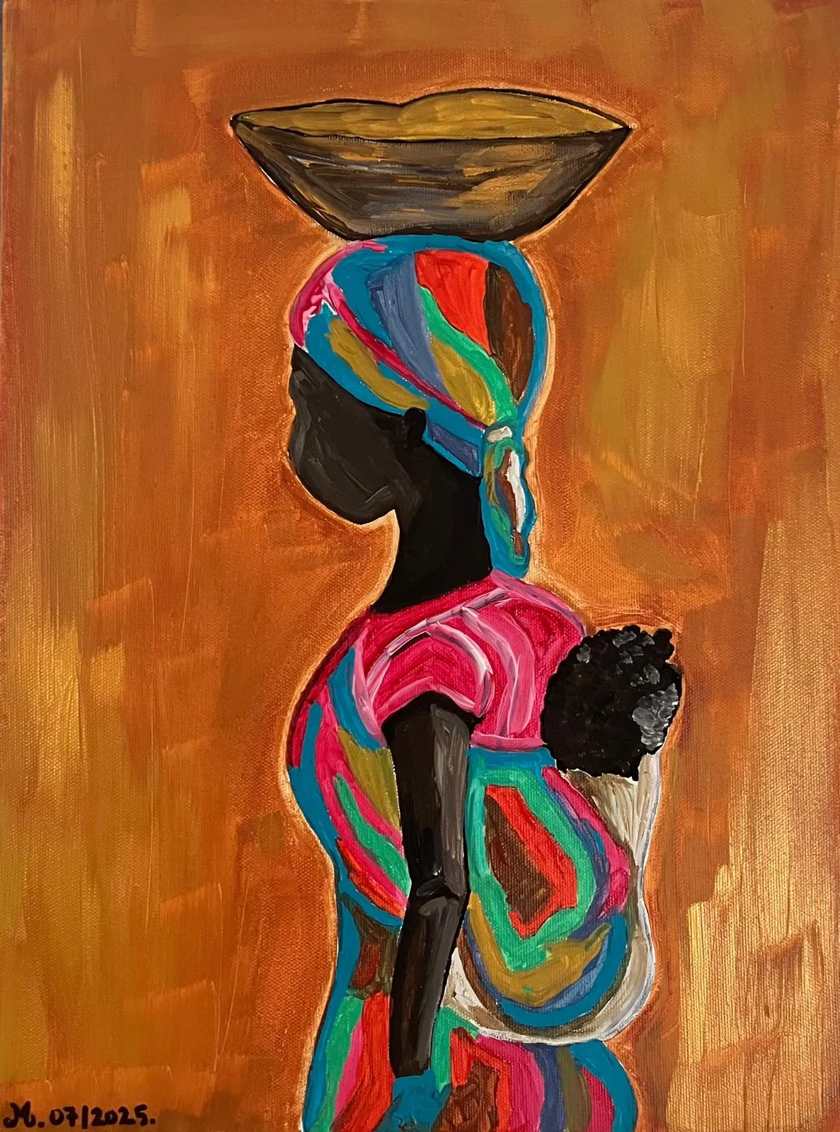 Roots: Mother and Child is inspired by memories of childhood in Ivory Coast, reflected through vibrant color and form. The composition centers on the quiet strength of the maternal figure, carrying both presence and history. Through bold patterns and warm tones, the work evokes a sense of belonging, heritage, and continuity—where identity is shaped by the places and relationships that ground us. More than a portrait, the piece captures the enduring bond between mother and child, expressed not through detail, but through color, rhythm, and emotion.