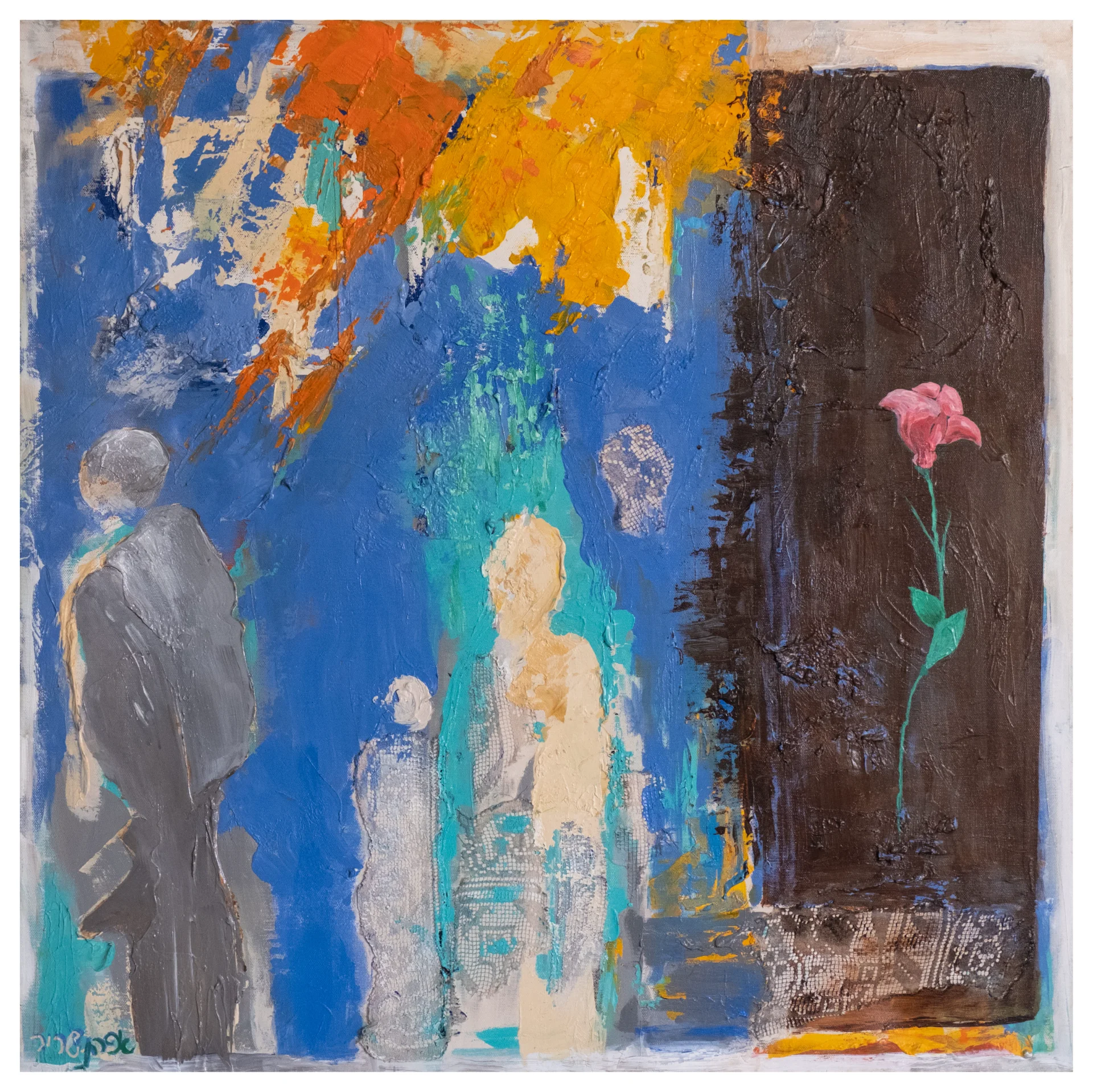 An expressive mixed-media composition combining bold abstract gestures with the delicate presence of a single rose. y