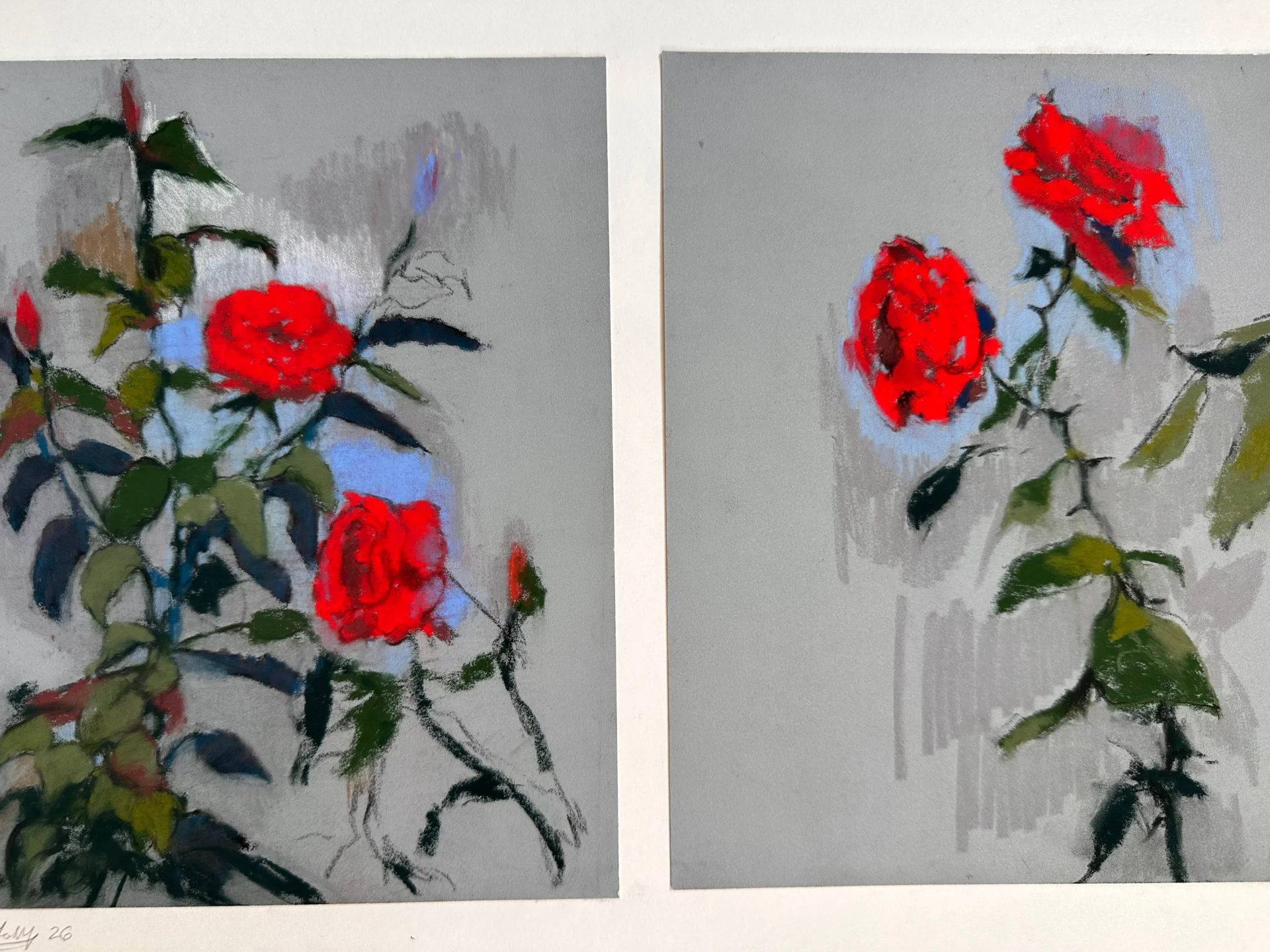 This contemporary diptych presents an evocative exploration of form and color. The work is characterized by the juxtaposition of flat color planes against loose, gestural sketching, inviting the viewer's imagination to fill in the spaces. The inherent tension between the bold, vivid red strokes and the subtle hints of blue and deep green lends the piece remarkable depth, despite its minimalist approach. Through its dual composition, the artwork invites a dialogue between stability and motion, capturing the delicate balance between the tangible and the suggested.