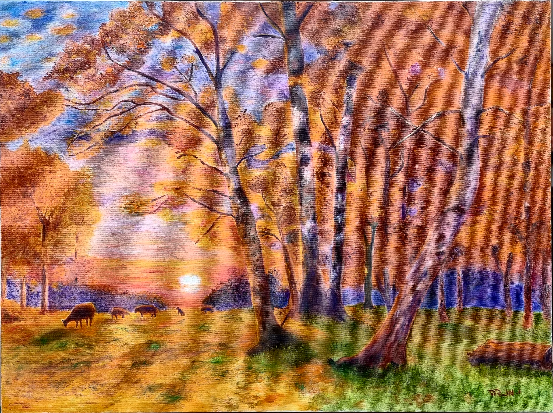 An original oil painting that invites the viewer into a moment of pastoral silence in the heart of nature. The painting captures the magical moment of sunset, when the sky and earth are colored in shades of gold, orange, and deep purple.