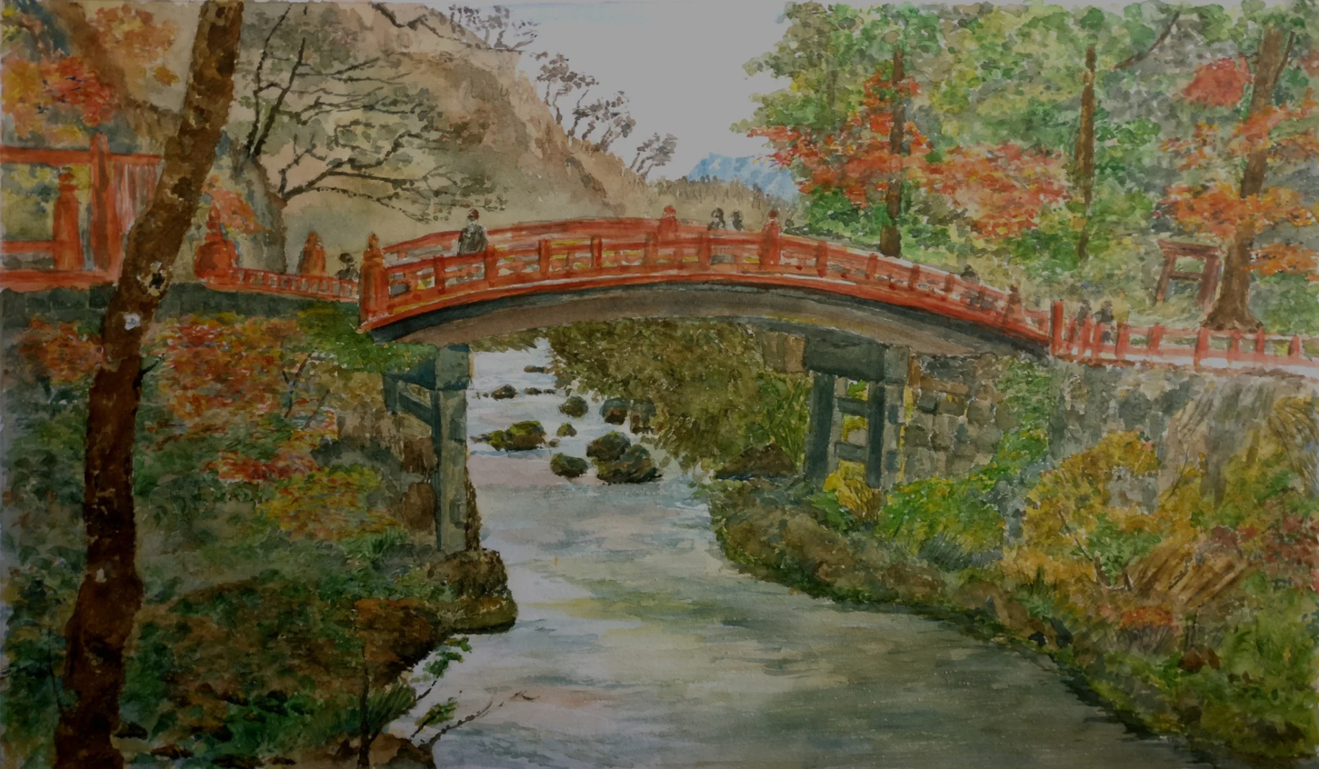 Watercolor painting of a centuries-old wooden bridge sacred to the Japanese, located at the entrance to the Nikko temple area, one of the most beautiful bridges in Japan.