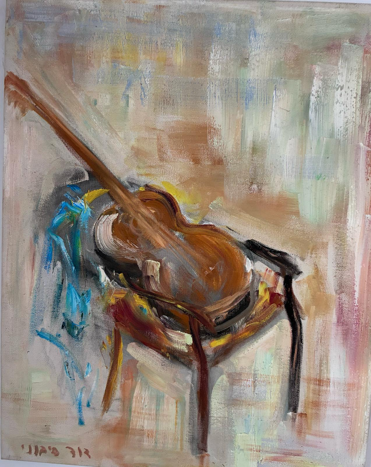 An expressive oil painting depicting a string instrument resting on a chair, rendered with loose brushwork, soft tonal transitions, and an atmospheric abstract background. The composition balances intimacy and movement while highlighting texture and painterly gesture.