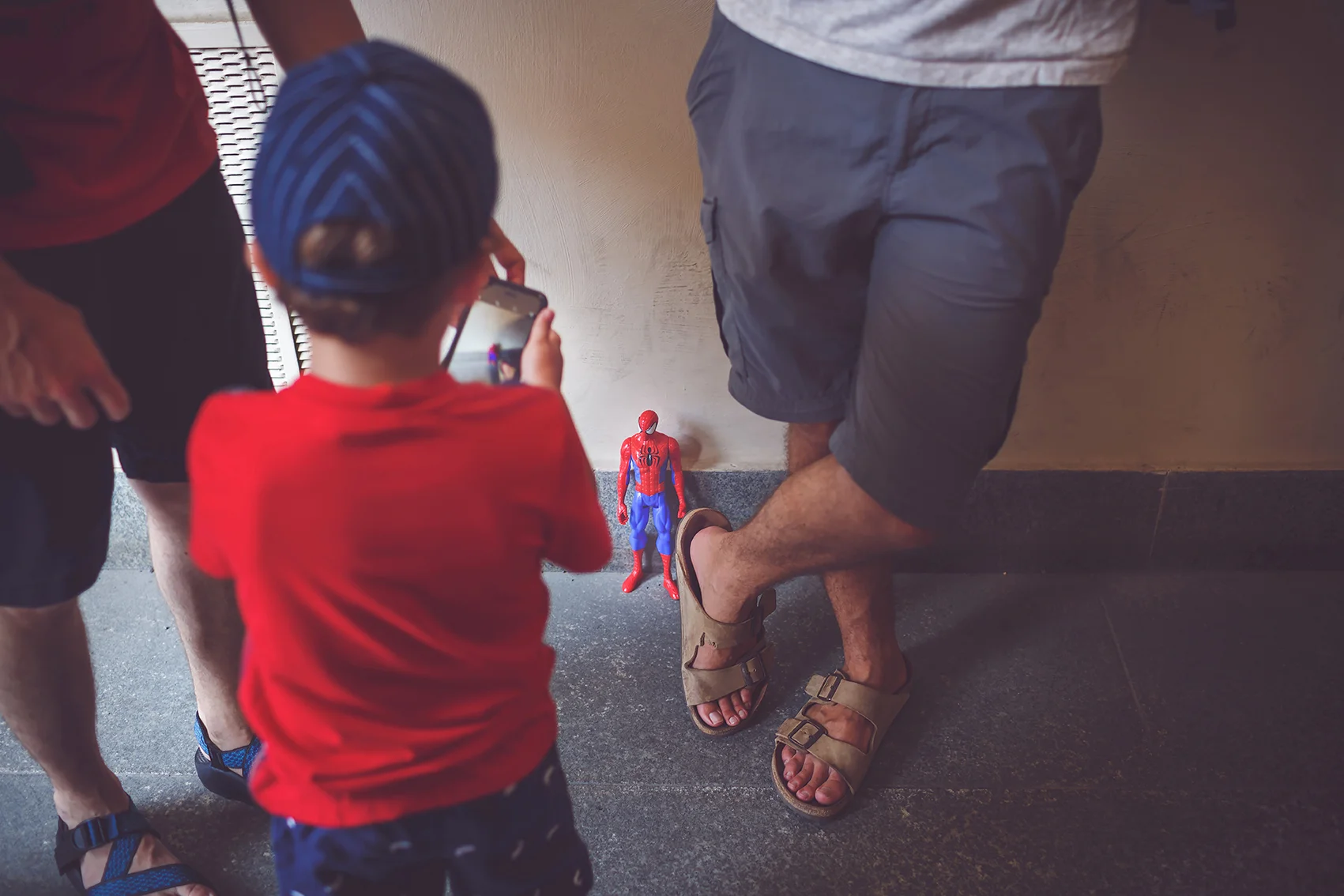 A young boy taking a picture of his friend, Spiderman, on his dad's phone