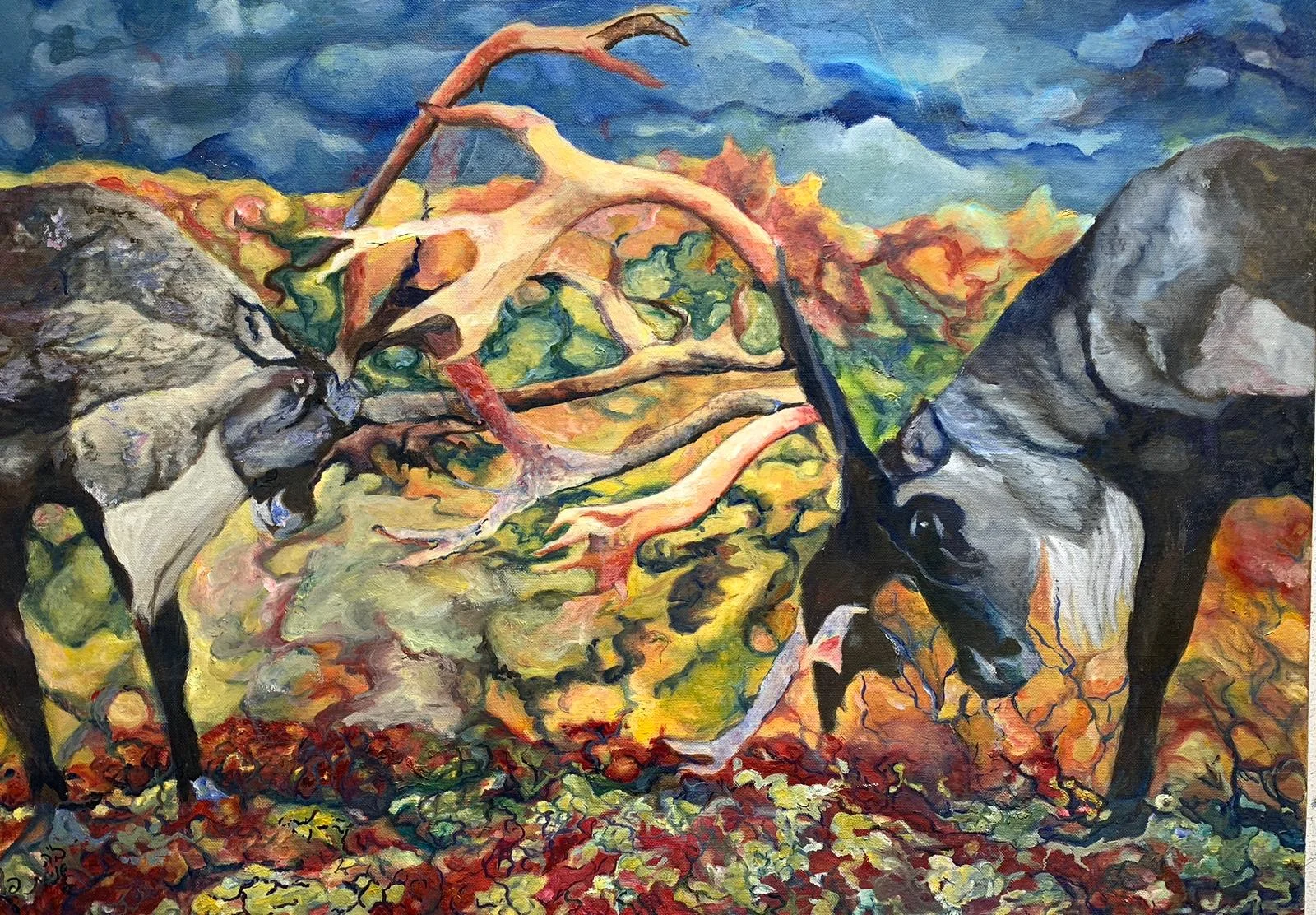 An expressive painting depicting two rams in a tense confrontation, using dynamic coloration, layers of brushstrokes and an imagined landscape to express steadfastness, struggle and inner strength.