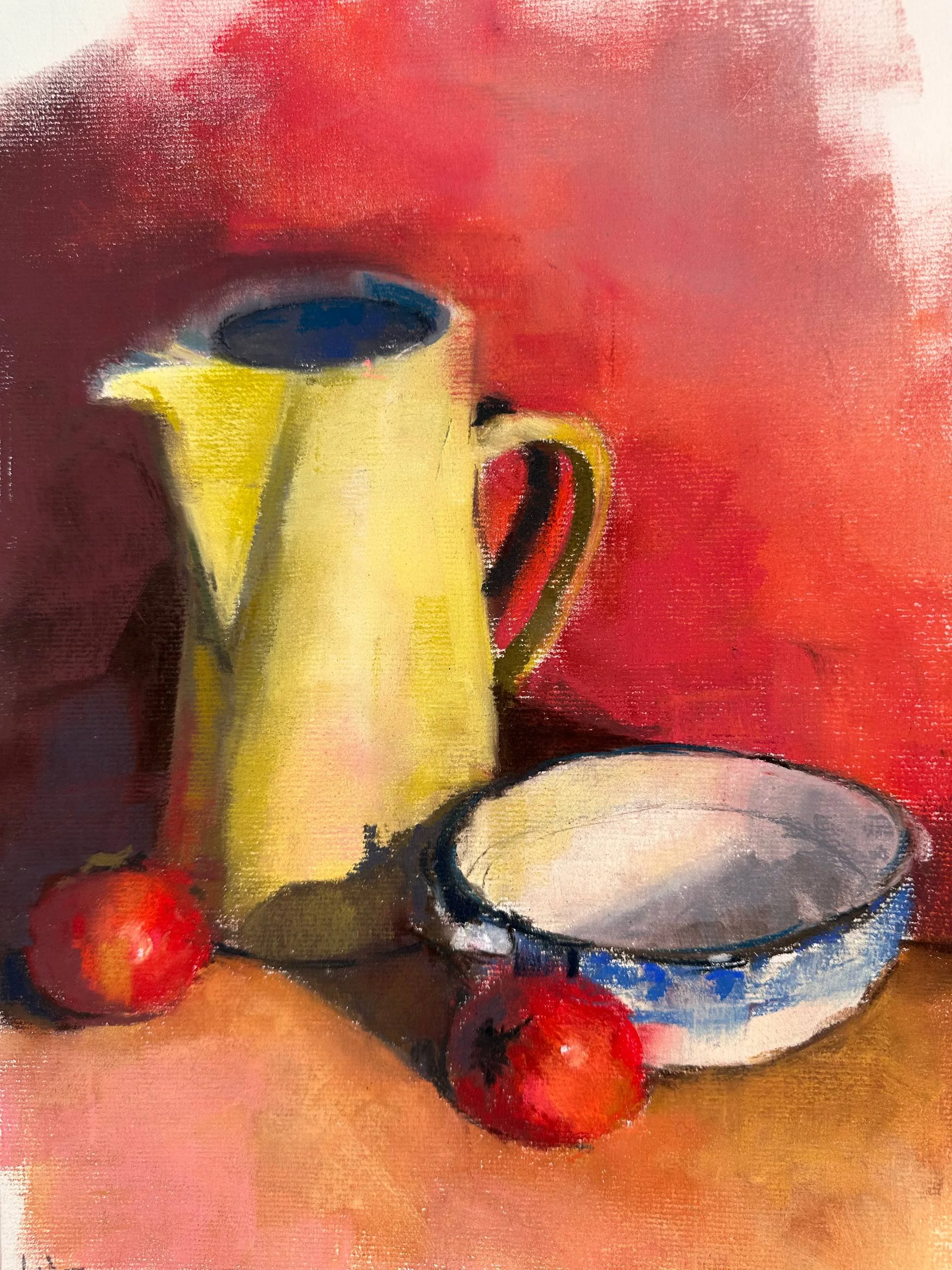 A vibrant and warm pastel work, featuring an intimate composition of everyday objects: a ceramic pitcher, an enamel bowl, and two ripe tomatoes. The piece is characterized by the rich texture of the pastel and a bold color play, ranging from a dramatic red-orange background to subtle ochre and blue tones in the objects. The play of light and shadow, combined with the loose style, lends the artwork a feeling of vitality and freshness.