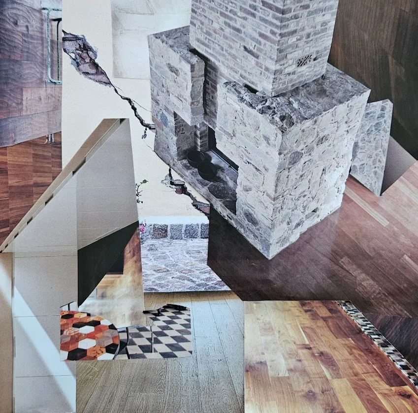 The collage presents different structural planes, including a volumetric structure that seemingly floats even though it is made of stone. This appearance creates imbalance and a sense of search in the observer.