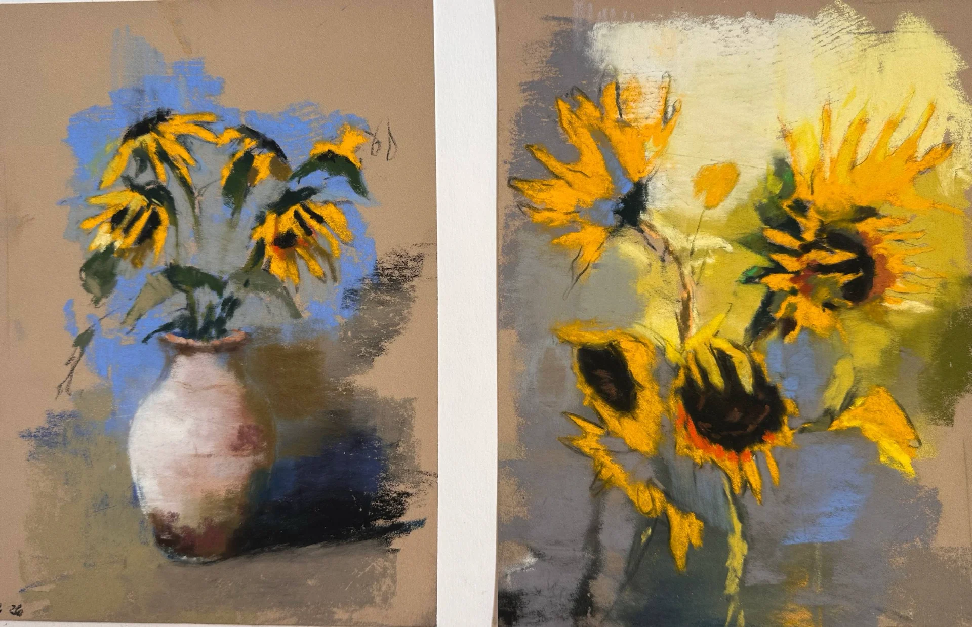 A dialogue between two perspectives of the same flower. This piece explores the sunflower through expressive, loose sketching, where line and color take precedence over precision. On one side, the stability of a vase; on the other, an explosion of yellow and vitality. It is an exercise in visual freedom, celebrating the raw, tactile touch of pastel on paper.