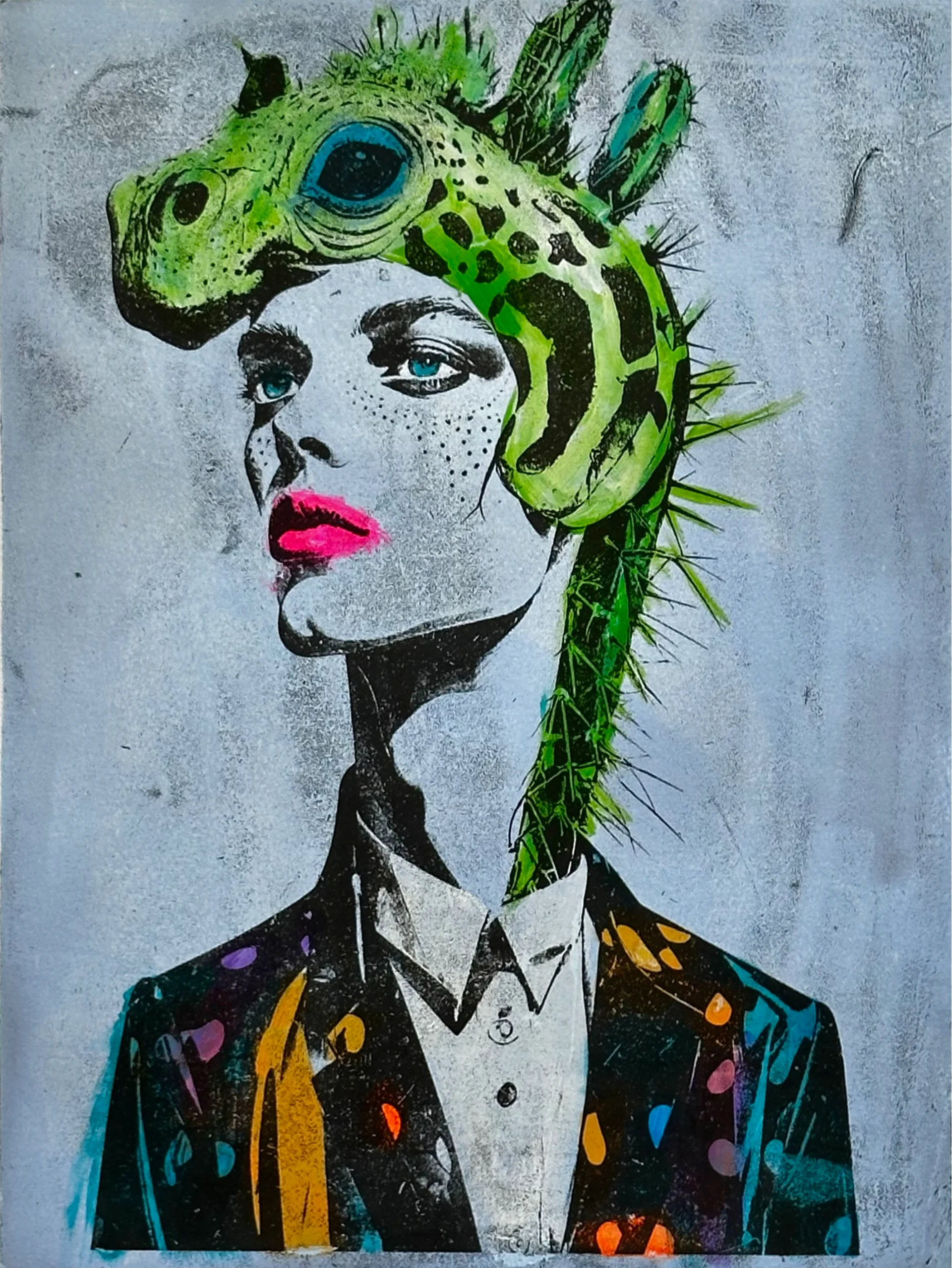 An original Gelli plate print surrealistically depicting a playful, fashionable figure that blends a human with a creature growing upon it, together forming a symbiotic being; reflecting on future integrations between nature and humanity.