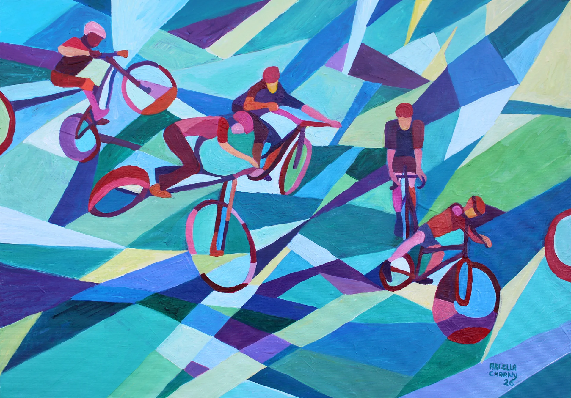 Dynamic artwork in a unique geometric and cubist style, reflecting the artist's love of cycling. A perfect artwork for bike enthusiasts.