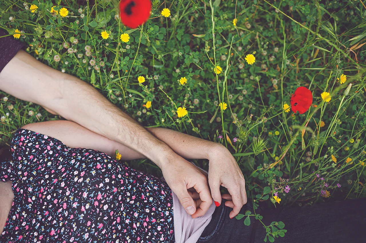A couple laying on the grass, having a moment for themselves