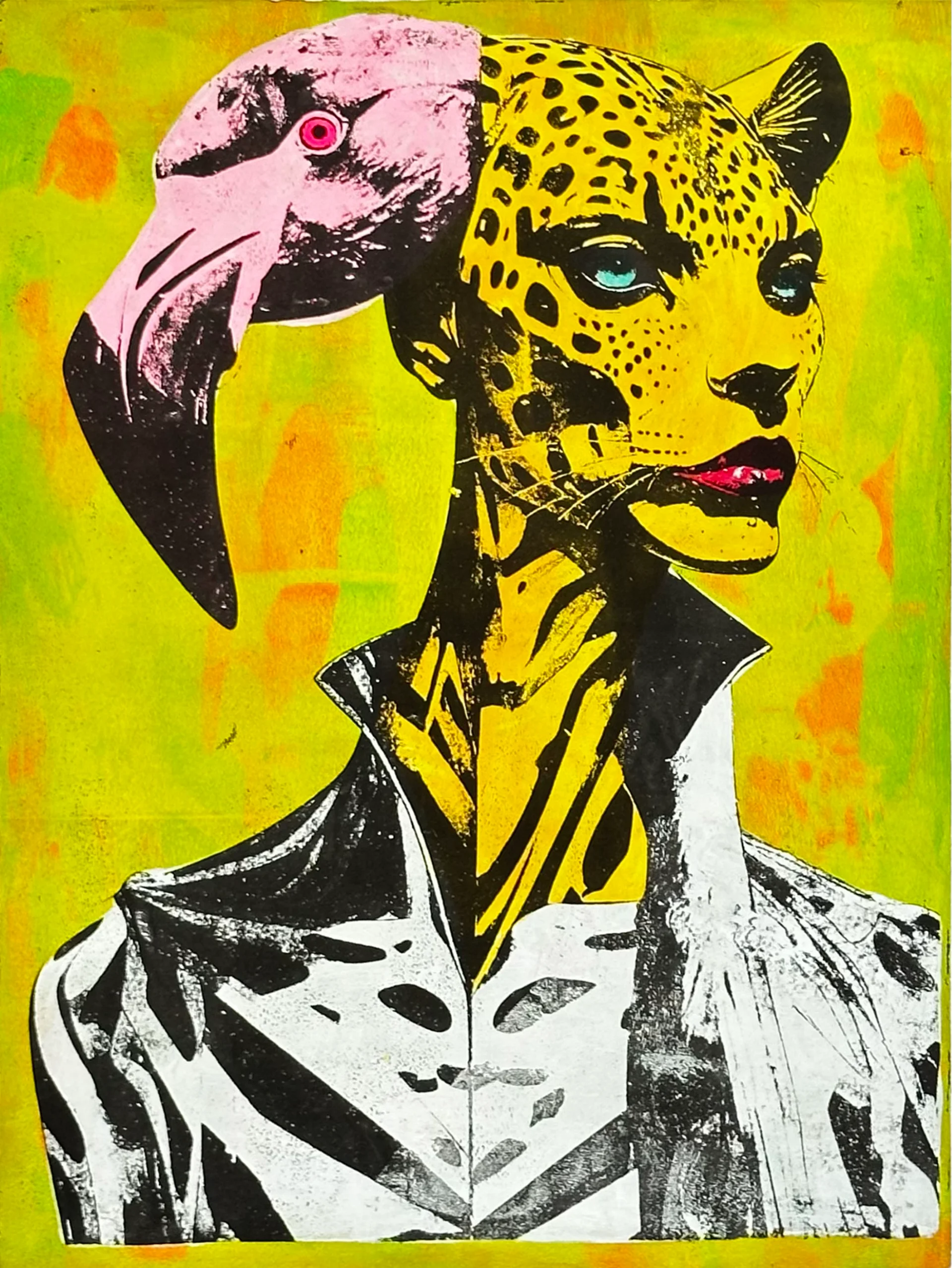 A surreal hybrid portrait, combining the face of a yellow leopard and the head of a pink flamingo. The figure is dressed in a tailored black and white zebra-print jacket, against a background of lime and orange. The work presents a visual interpretation of the symbiosis between contrasting elements of nature in the form of an organic and comical collage.