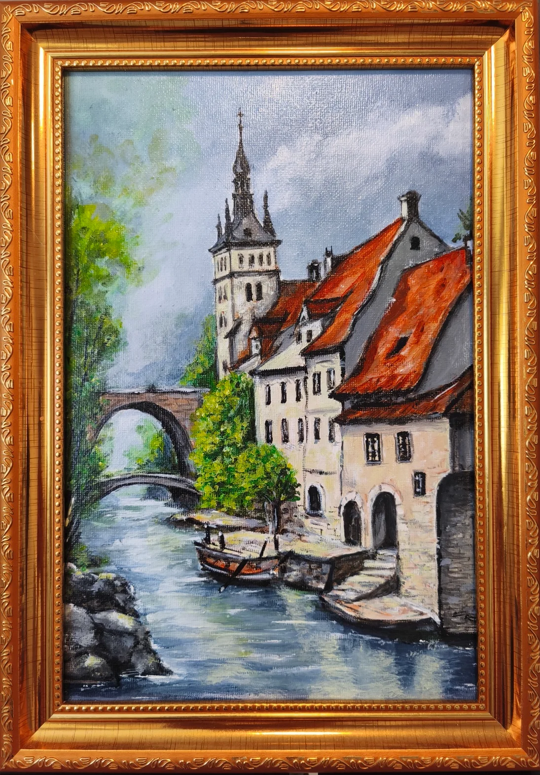 A poetic cityscape painting depicting a tranquil riverside scene with historic architecture, arched bridges, and moored boats. Soft atmospheric tones and expressive brushwork evoke a timeless European charm and a quiet sense of reflection.